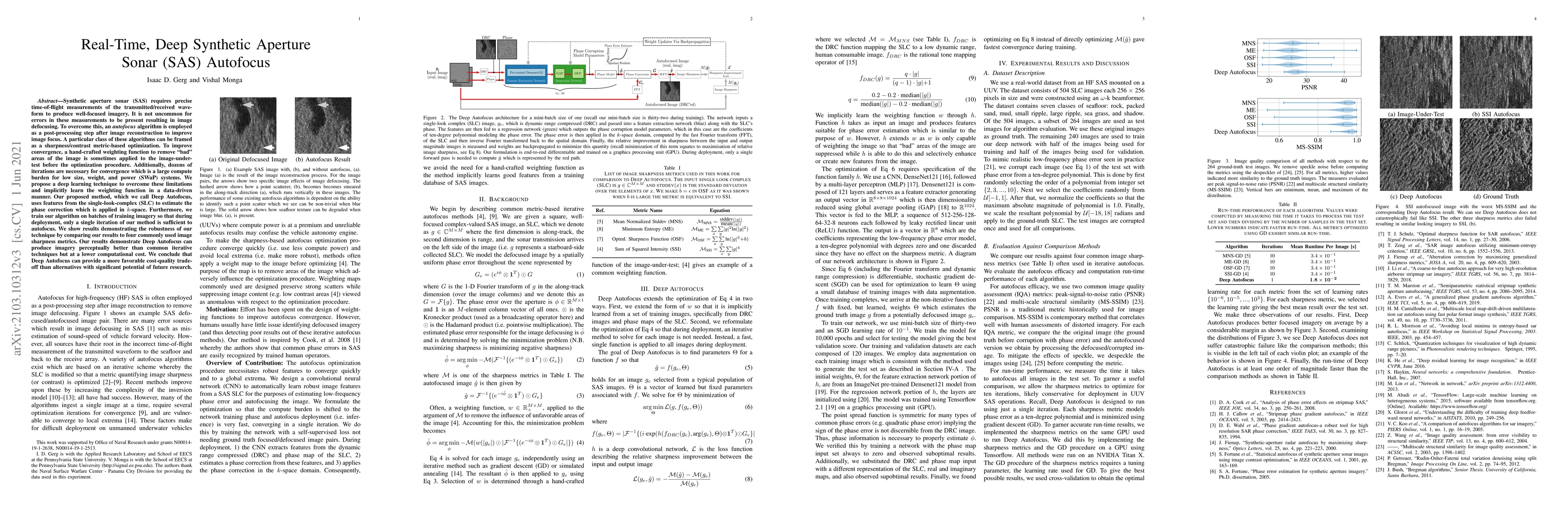 The paper proposes Deep Autofocus, a deep learning technique for real-time synthetic aperture sonar (SAS) autofocus, which implicitly learns a weighting function to improve image focus. Unlike traditional iterative methods, Deep Autofocus requires only a single iteration for convergence, significantly reducing computational costs while producing perceptually better imagery.