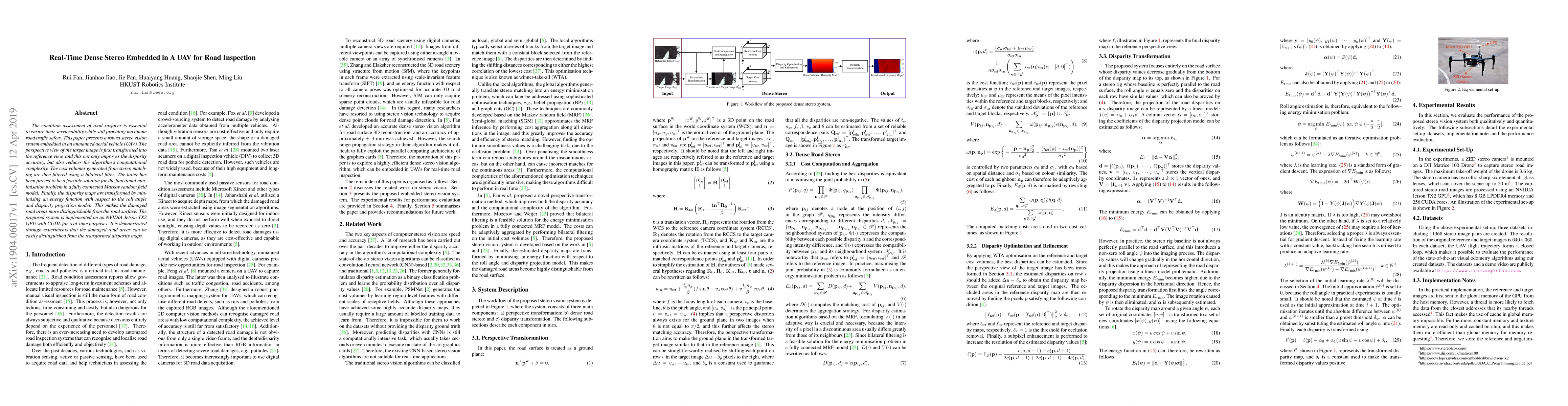 The paper presents a robust stereo vision system embedded in a UAV for road inspection, utilizing perspective transformation, disparity computation, optimization, and refinement, followed by disparity transformation for distinguishing damaged road areas.