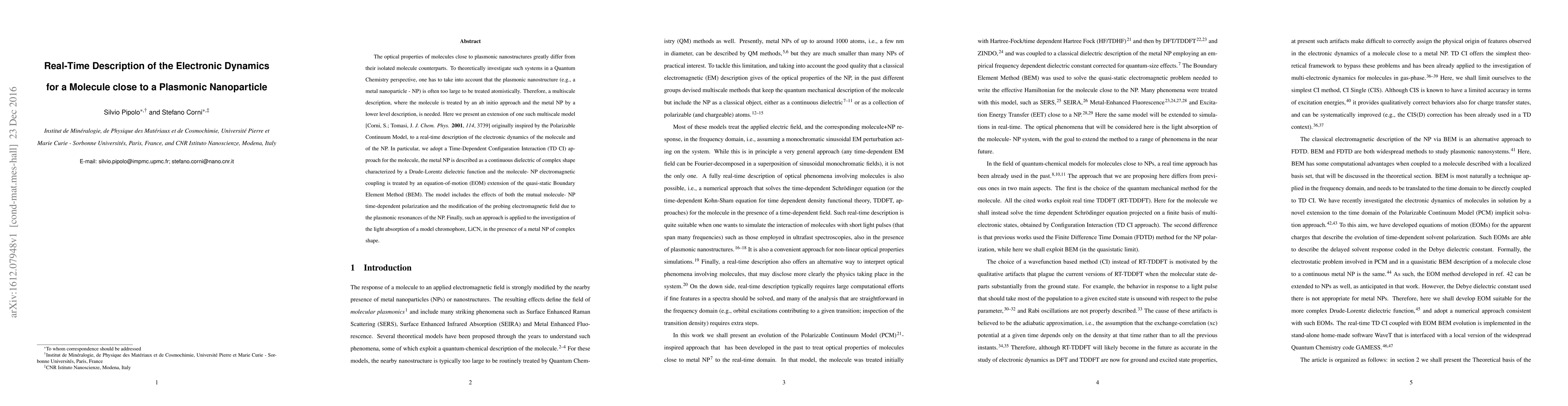 This paper presents a multiscale model combining ab initio quantum chemistry and a lower-level description for plasmonic nanoparticles to simulate the real-time electronic dynamics of molecules near these nanoparticles. The model employs Time-Dependent Configuration Interaction for the molecule and a Drude-Lorentz dielectric function for the nanoparticle, with electromagnetic coupling treated via an EOM-BEM extension, and is applied to study the light absorption of a LiCN chromophore near a metal nanoparticle.