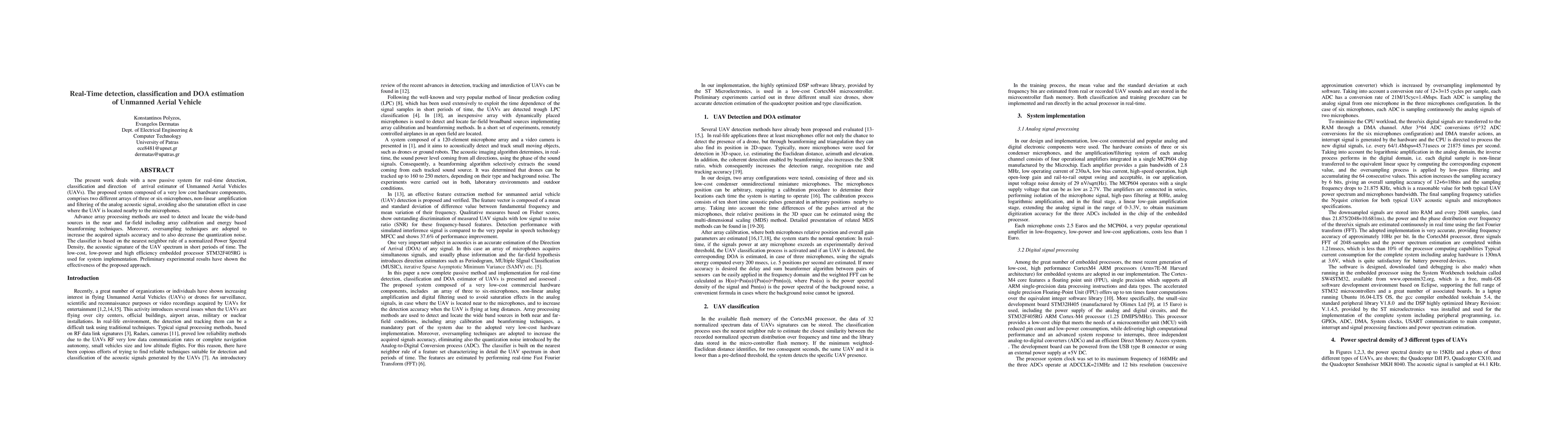 The present work deals with a new passive system for real-time detection, classification and direction of arrival estimator of Unmanned Aerial Vehicles (UAVs). The proposed system composed of a very low cost hardware components, comprises two different arrays of three or six-microphones, non-linear amplification and filtering of the analog acoustic signal, avoiding also the saturation effect in case where the UAV is located nearby to the microphones. Advance array processing methods are used to detect and locate the wide-band sources in the near and far-field including array calibration and energy based beamforming techniques. Moreover, oversampling techniques are adopted to increase the acquired signals accuracy and to also decrease the quantization noise. The classifier is based on the nearest neighbor rule of a normalized Power Spectral Density, the acoustic signature of the UAV spectrum in short periods of time. The low-cost, low-power and high efficiency embedded processor STM32F405RG is used for system implementation. Preliminary experimental results have shown the effectiveness of the proposed approach.
