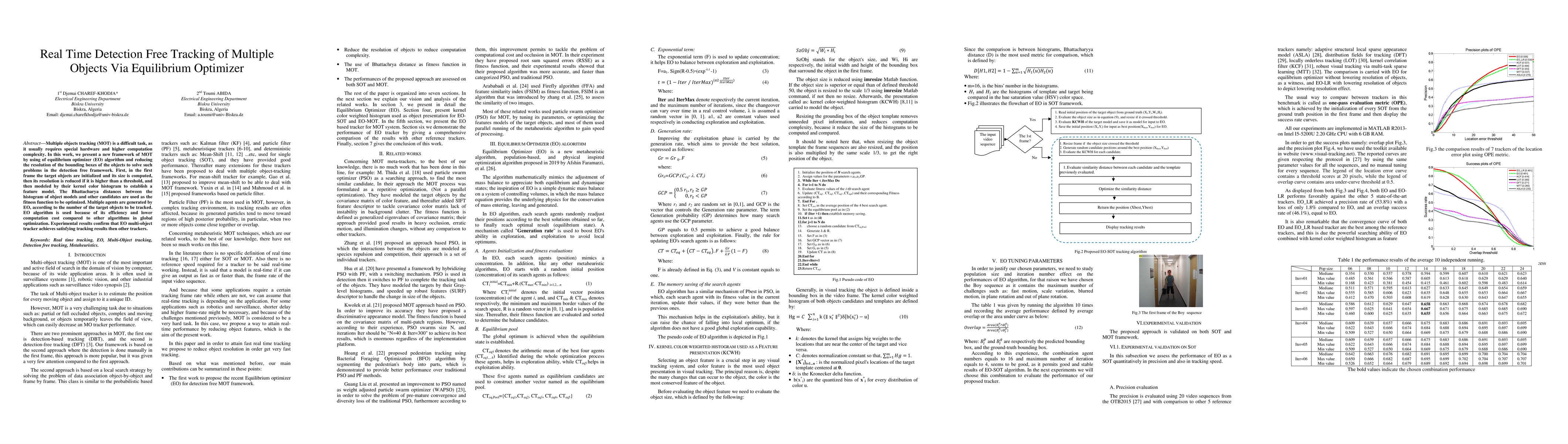 A new tracking framework uses equilibrium optimizer to detect and track multiple objects in real-time without special hardware or high computation complexity, achieving satisfying results compared to other trackers.