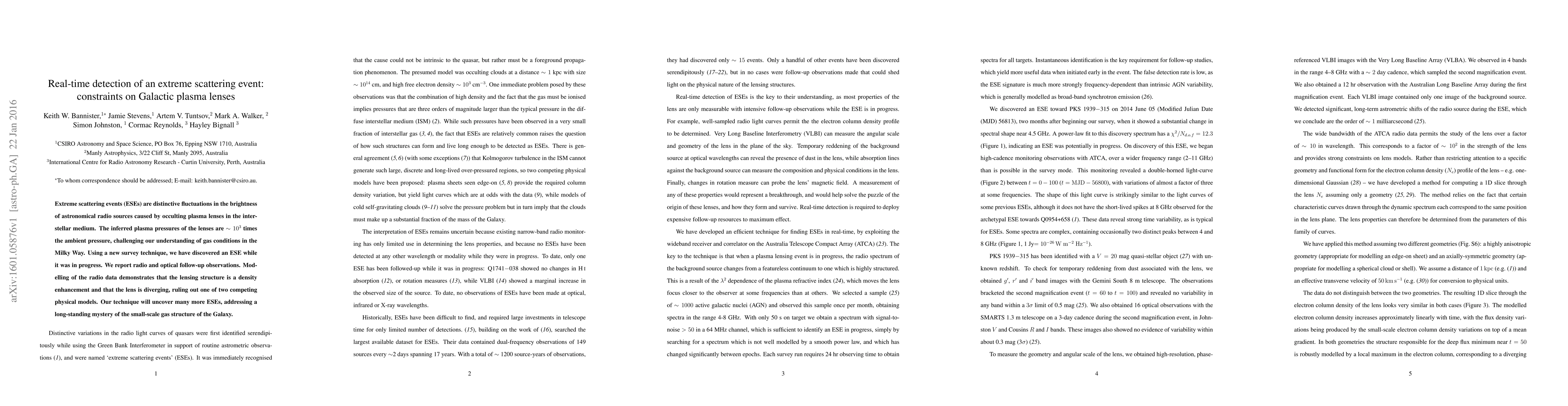 Extreme scattering events (ESEs) are distinctive fluctuations in the brightness of astronomical radio sources caused by occulting plasma lenses in the interstellar medium. The inferred plasma pressures of the lenses are $\sim 10^3$ times the ambient pressure, challenging our understanding of gas conditions in the Milky Way. Using a new survey technique, we have discovered an ESE while it was in progress. We report radio and optical follow-up observations. Modelling of the radio data demonstrates that the lensing structure is a density enhancement and that the lens is diverging, ruling out one of two competing physical models. Our technique will uncover many more ESEs, addressing a long-standing mystery of the small-scale gas structure of the Galaxy.