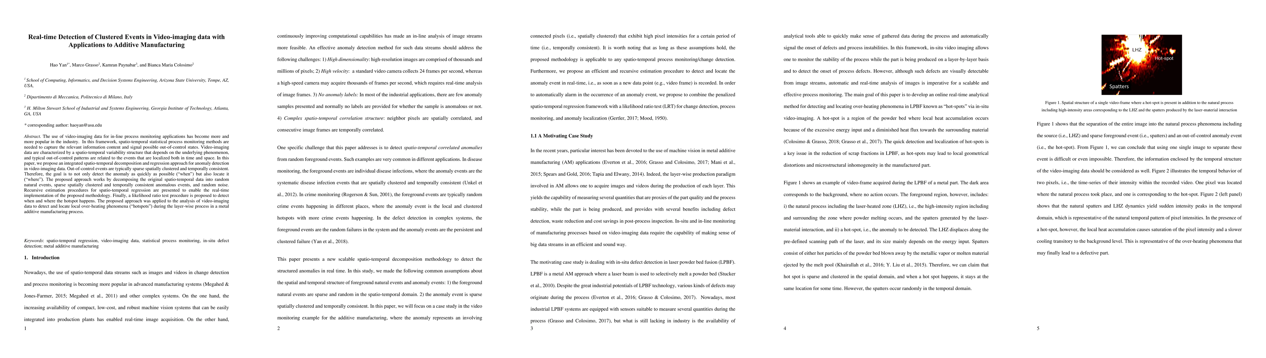 The use of video-imaging data for in-line process monitoring applications has become more and more popular in the industry. In this framework, spatio-temporal statistical process monitoring methods are needed to capture the relevant information content and signal possible out-of-control states. Video-imaging data are characterized by a spatio-temporal variability structure that depends on the underlying phenomenon, and typical out-of-control patterns are related to the events that are localized both in time and space. In this paper, we propose an integrated spatio-temporal decomposition and regression approach for anomaly detection in video-imaging data. Out-of-control events are typically sparse spatially clustered and temporally consistent. Therefore, the goal is to not only detect the anomaly as quickly as possible ("when") but also locate it ("where"). The proposed approach works by decomposing the original spatio-temporal data into random natural events, sparse spatially clustered and temporally consistent anomalous events, and random noise. Recursive estimation procedures for spatio-temporal regression are presented to enable the real-time implementation of the proposed methodology. Finally, a likelihood ratio test procedure is proposed to detect when and where the hotspot happens. The proposed approach was applied to the analysis of video-imaging data to detect and locate local over-heating phenomena ("hotspots") during the layer-wise process in a metal additive manufacturing process.