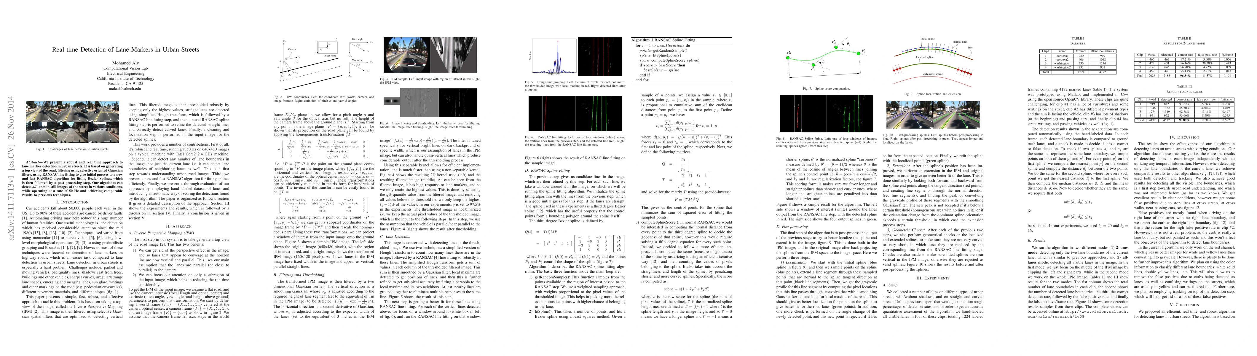 We present a robust and real time approach to lane marker detection in urban streets. It is based on generating a top view of the road, filtering using selective oriented Gaussian filters, using RANSAC line fitting to give initial guesses to a new and fast RANSAC algorithm for fitting Bezier Splines, which is then followed by a post-processing step. Our algorithm can detect all lanes in still images of the street in various conditions, while operating at a rate of 50 Hz and achieving comparable results to previous techniques.