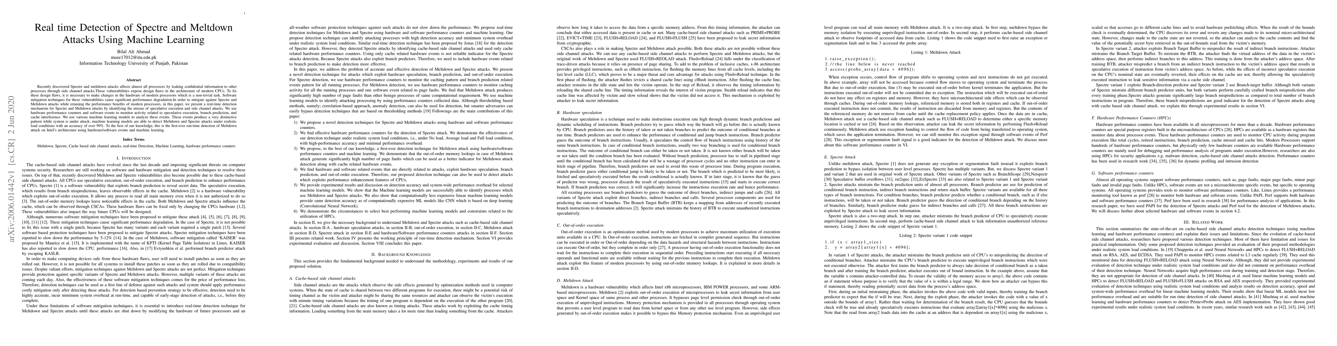 This paper proposes a real-time detection mechanism for Spectre and Meltdown attacks using machine learning, identifying misuse of speculative execution and side-channel attacks through monitoring hardware performance counters and software events. The approach achieves over 99% accuracy in detecting these attacks under realistic conditions.