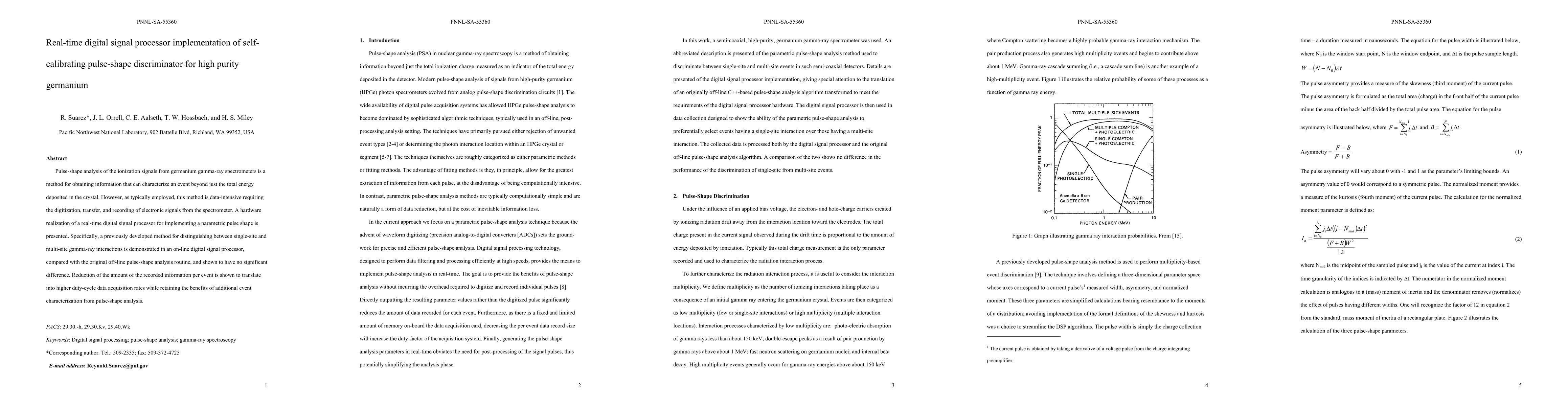 This paper presents a real-time digital signal processor for implementing a self-calibrating pulse-shape discriminator in high purity germanium gamma-ray spectrometers, achieving real-time event characterization without significant loss of accuracy compared to traditional methods. The implementation reduces recorded data per event, thereby increasing data acquisition rates.