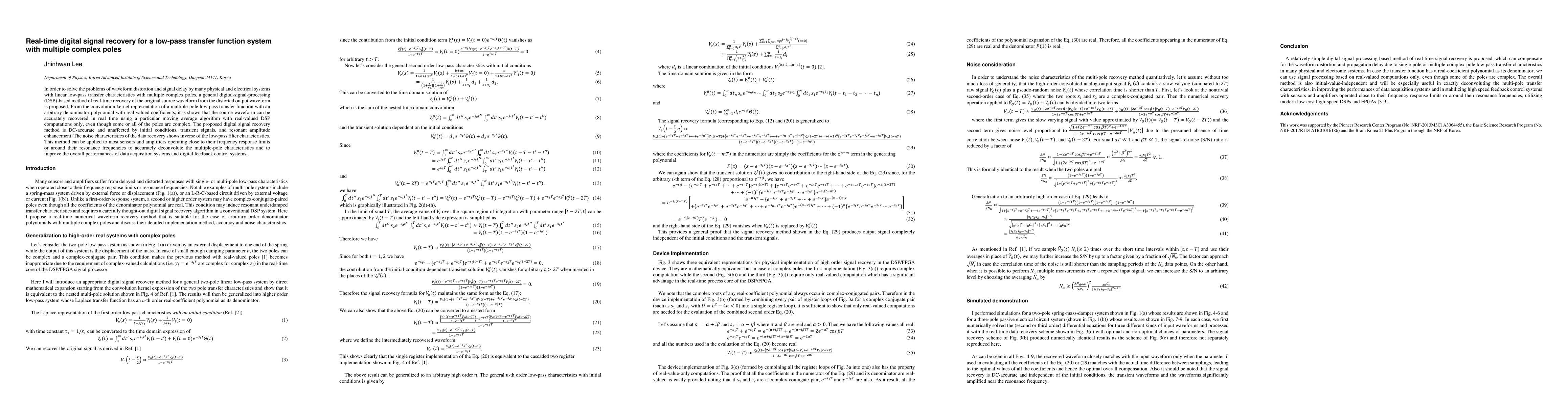 In order to solve the problems of waveform distortion and signal delay by many physical and electrical systems with linear low-pass transfer characteristics with multiple complex poles, a general digital-signal-processing (DSP)-based method of real-time recovery of the original source waveform from the distorted output waveform is proposed. From the convolution kernel representation of a multiple-pole low-pass transfer function with an arbitrary denominator polynomial with real valued coefficients, it is shown that the source waveform can be accurately recovered in real time using a particular moving average algorithm with real-valued DSP computations only, even though some or all of the poles are complex. The proposed digital signal recovery method is DC-accurate and unaffected by initial conditions, transient signals, and resonant amplitude enhancement. The noise characteristics of the data recovery shows inverse of the low-pass filter characteristics. This method can be applied to most sensors and amplifiers operating close to their frequency response limits or around their resonance frequencies to accurately deconvolute the multiple-pole characteristics and to improve the overall performances of data acquisition systems and digital feedback control systems.