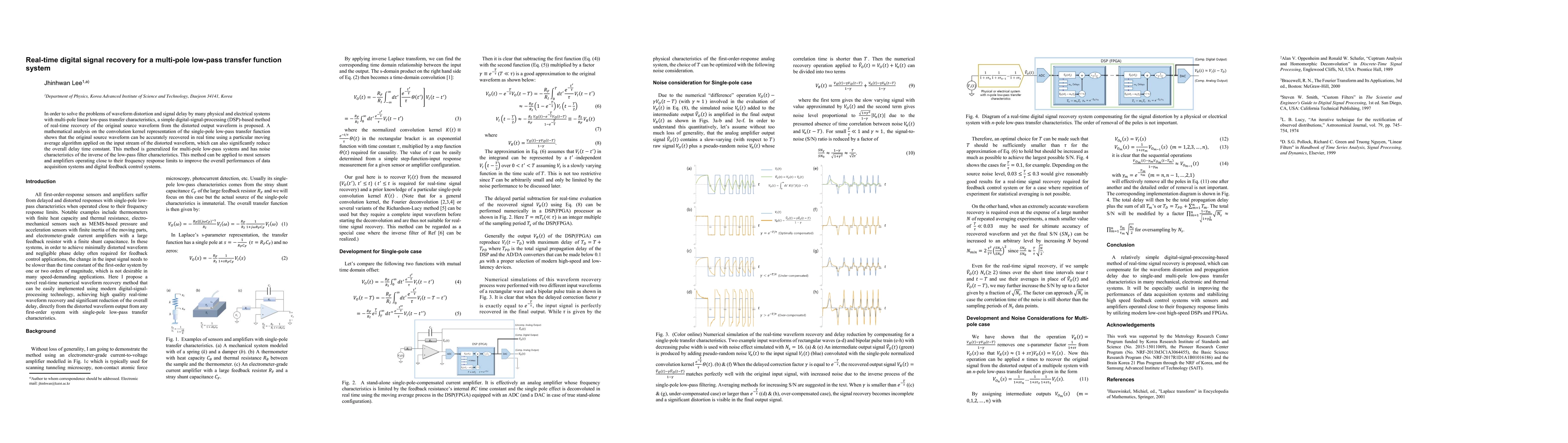 This paper proposes a DSP-based method for real-time recovery of original source waveforms from distorted outputs in multi-pole low-pass systems, using a moving average algorithm to minimize waveform distortion and delay. The method generalizes to multi-pole systems and improves performance in data acquisition and control systems.