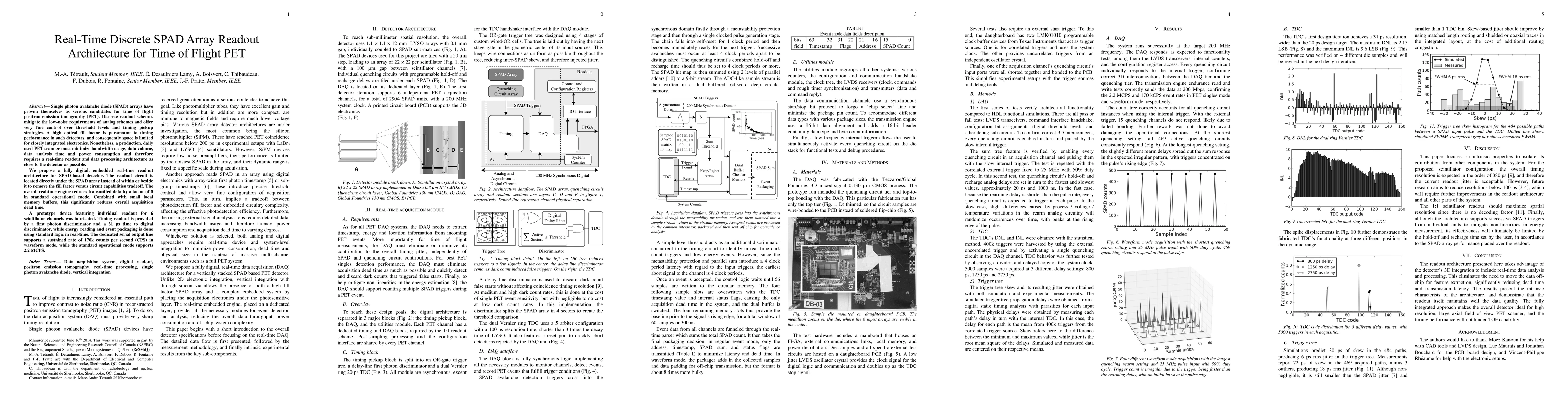This paper proposes a real-time digital readout architecture for SPAD arrays in PET scanners, reducing data volume, power consumption, and acquisition dead time by 8 times compared to traditional analog schemes.