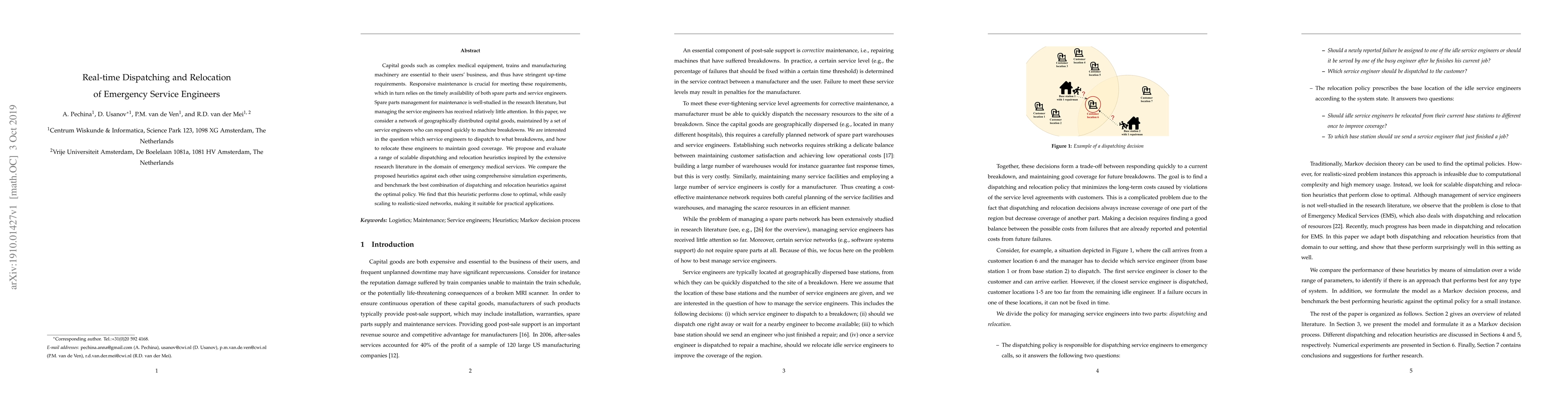 This paper proposes scalable heuristics for dispatching and relocating emergency service engineers to maintain high up-time for geographically distributed capital goods. The study finds that the best heuristics perform nearly as well as the optimal policy, making them practical for real-time applications.