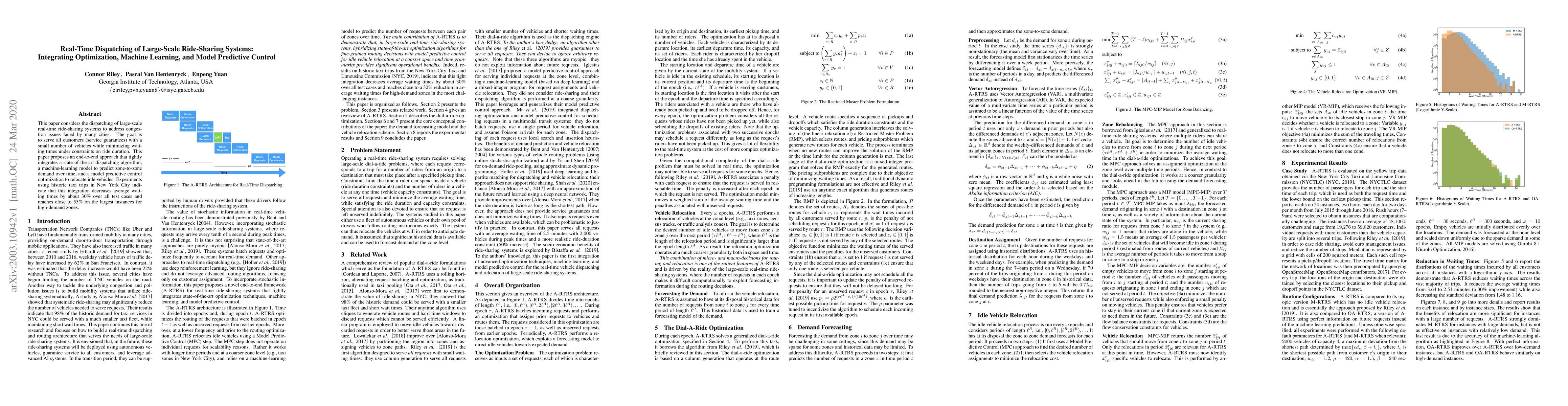 This paper proposes an integrated approach combining optimization, machine learning, and model predictive control to dispatch large-scale ride-sharing systems efficiently, achieving a 30% reduction in average waiting times and up to 55% in high-demand zones. Experiments in New York City validate the effectiveness of the proposed method.