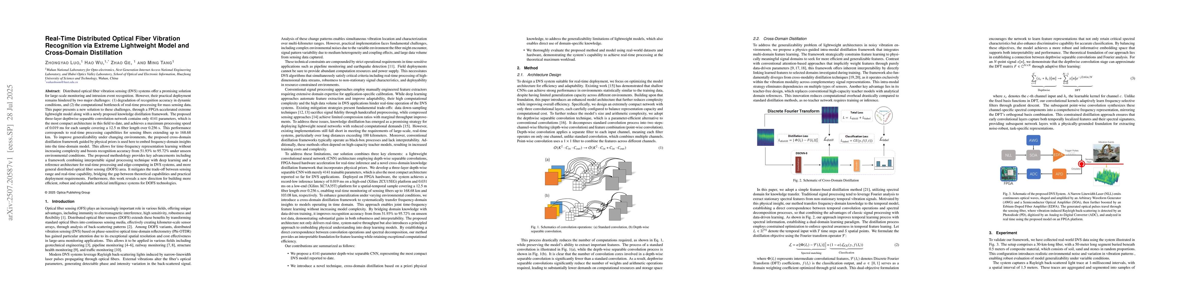 Distributed optical fiber vibration sensing (DVS) systems offer a promising solution for large-scale monitoring and intrusion event recognition. However, their practical deployment remains hindered by two major challenges: degradation of recognition accuracy in dynamic conditions, and the computational bottleneck of real-time processing for mass sensing data. This paper presents a new solution to these challenges, through a FPGA-accelerated extreme lightweight model along with a newly proposed knowledge distillation framework. The proposed three-layer depthwise separable convolution network contains only 4141 parameters, which is the most compact architecture in this field to date, and achieves a maximum processing speed of 0.019 ms for each sample covering a 12.5 m fiber length over 0.256 s. This performance corresponds to real-time processing capabilities for sensing fibers extending up to 168.68 km. To improve generalizability under changing environments, the proposed cross-domain distillation framework guided by physical priors is used here to embed frequency-domain insights into the time-domain model. This allows for time-frequency representation learning without increasing complexity and boosts recognition accuracy from 51.93% to 95.72% under unseen environmental conditions. The proposed methodology provides key advancements including a framework combining interpretable signal processing technique with deep learning and a reference architecture for real-time processing and edge-computing in DVS systems, and more general distributed optical fiber sensing (DOFS) area. It mitigates the trade-off between sensing range and real-time capability, bridging the gap between theoretical capabilities and practical deployment requirements. Furthermore, this work reveals a new direction for building more efficient, robust and explainable artificial intelligence systems for DOFS technologies.