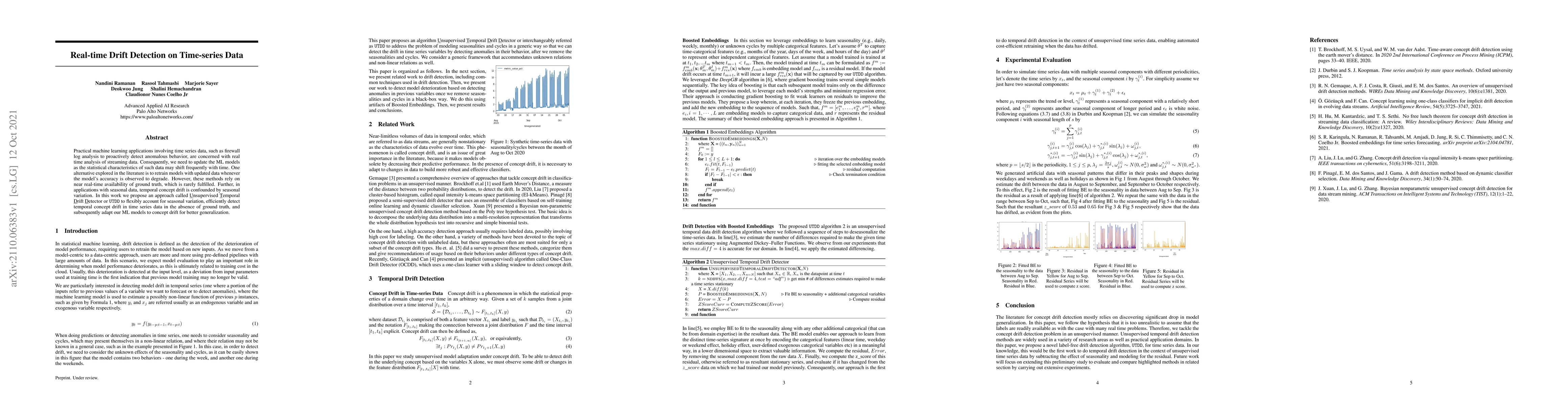 Practical machine learning applications involving time series data, such as firewall log analysis to proactively detect anomalous behavior, are concerned with real time analysis of streaming data. Consequently, we need to update the ML models as the statistical characteristics of such data may shift frequently with time. One alternative explored in the literature is to retrain models with updated data whenever the models accuracy is observed to degrade. However, these methods rely on near real time availability of ground truth, which is rarely fulfilled. Further, in applications with seasonal data, temporal concept drift is confounded by seasonal variation. In this work, we propose an approach called Unsupervised Temporal Drift Detector or UTDD to flexibly account for seasonal variation, efficiently detect temporal concept drift in time series data in the absence of ground truth, and subsequently adapt our ML models to concept drift for better generalization.