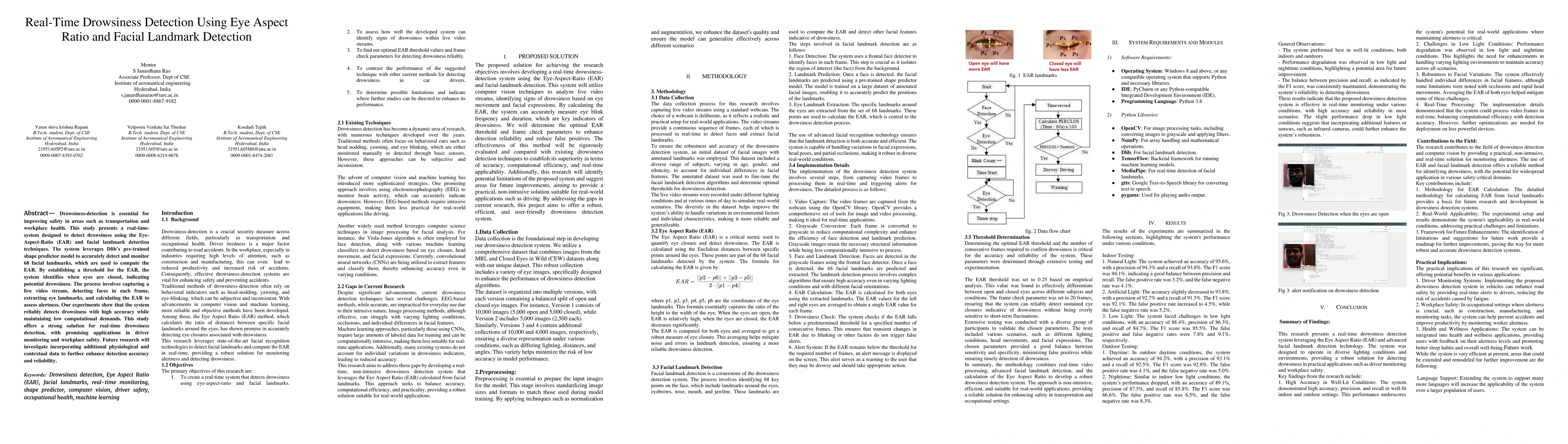 This paper proposes a real-time drowsiness detection system using Eye Aspect Ratio (EAR) and facial landmark detection, achieving high accuracy and low computational demands. The system effectively identifies potential drowsiness by monitoring eye closure through live video stream analysis.