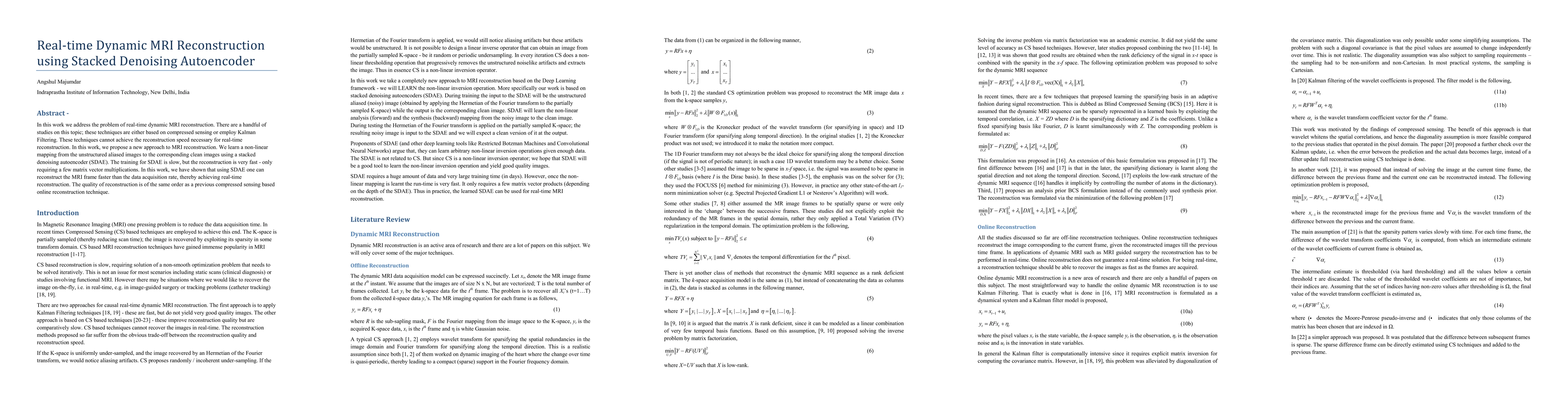 This paper proposes a real-time dynamic MRI reconstruction method using a stacked denoising autoencoder (SDAE) to learn a non-linear mapping from aliased images to clean images, achieving faster reconstruction speeds than traditional compressed sensing or Kalman Filtering techniques.