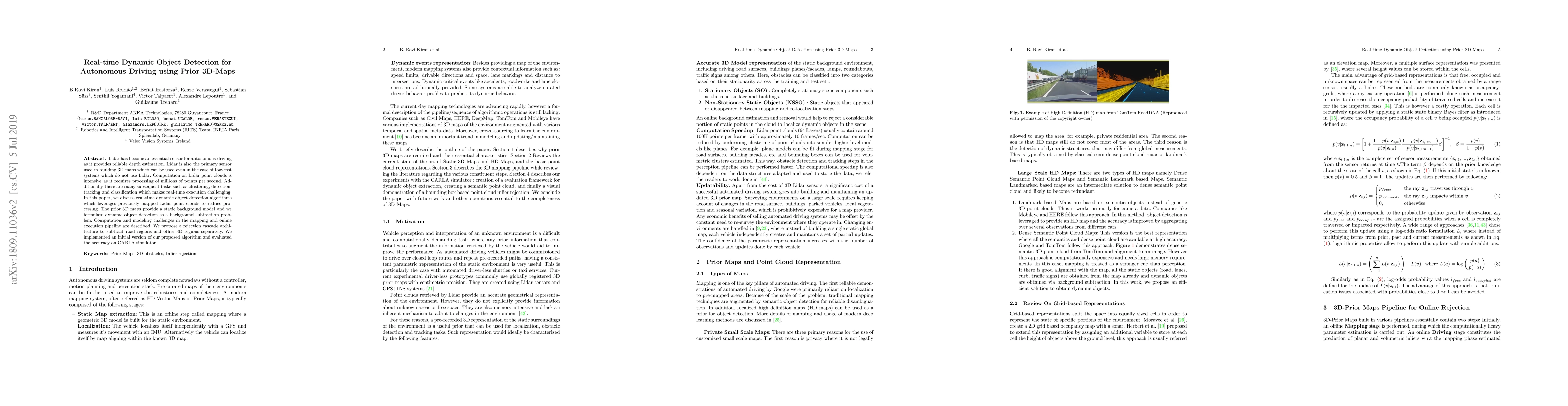 This paper proposes real-time dynamic object detection algorithms for autonomous driving that leverage prior 3D maps to reduce processing load. The method formulates detection as a background subtraction problem using static background models from mapped Lidar point clouds, employing a rejection cascade architecture for efficient computation.