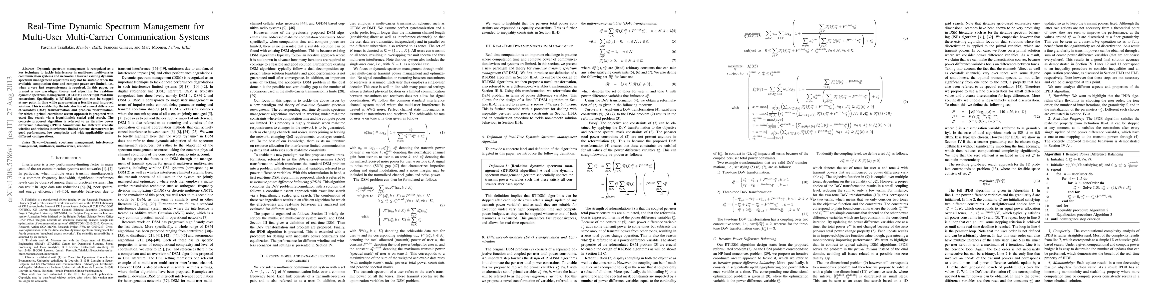 Dynamic spectrum management is recognized as a key technique to tackle interference in multi-user multi-carrier communication systems and networks. However existing dynamic spectrum management algorithms may not be suitable when the available computation time and compute power are limited, i.e., when a very fast responsiveness is required. In this paper, we present a new paradigm, theory and algorithm for real-time dynamic spectrum management (RT-DSM) under tight real-time constraints. Specifically, a RT-DSM algorithm can be stopped at any point in time while guaranteeing a feasible and improved solution. This is enabled by the introduction of a novel difference-of-variables (DoV) transformation and problem reformulation, for which a primal coordinate ascent approach is proposed with exact line search via a logarithmicly scaled grid search. The concrete proposed algorithm is referred to as iterative power difference balancing (IPDB). Simulations for different realistic wireline and wireless interference limited systems demonstrate its good performance, low complexity and wide applicability under different configurations.