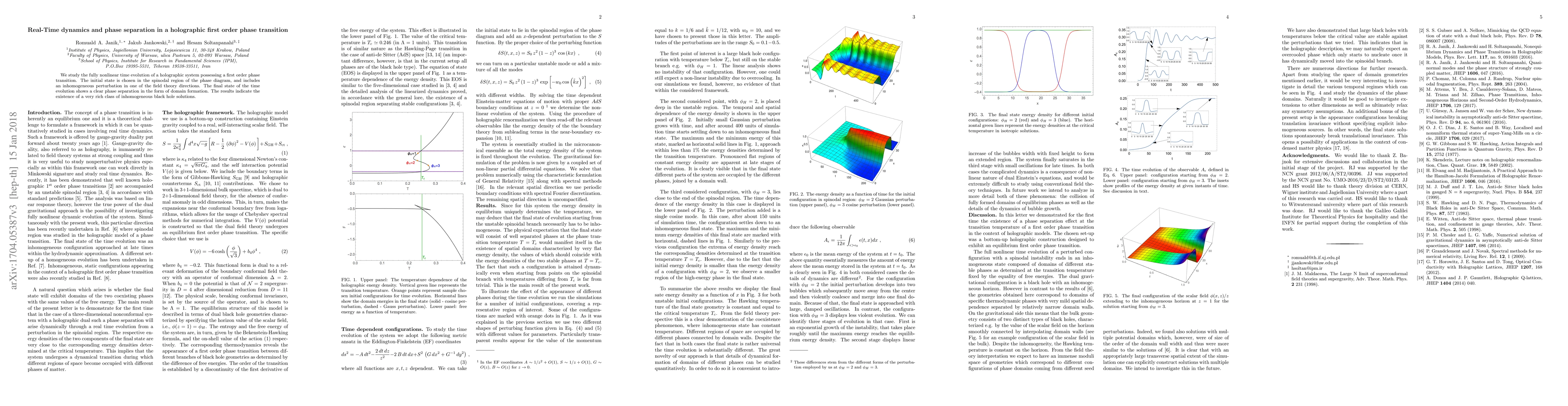This paper investigates the nonlinear time evolution of a holographic system undergoing a first-order phase transition, revealing a phase separation characterized by domain formation and identifying a diverse set of inhomogeneous black hole solutions.