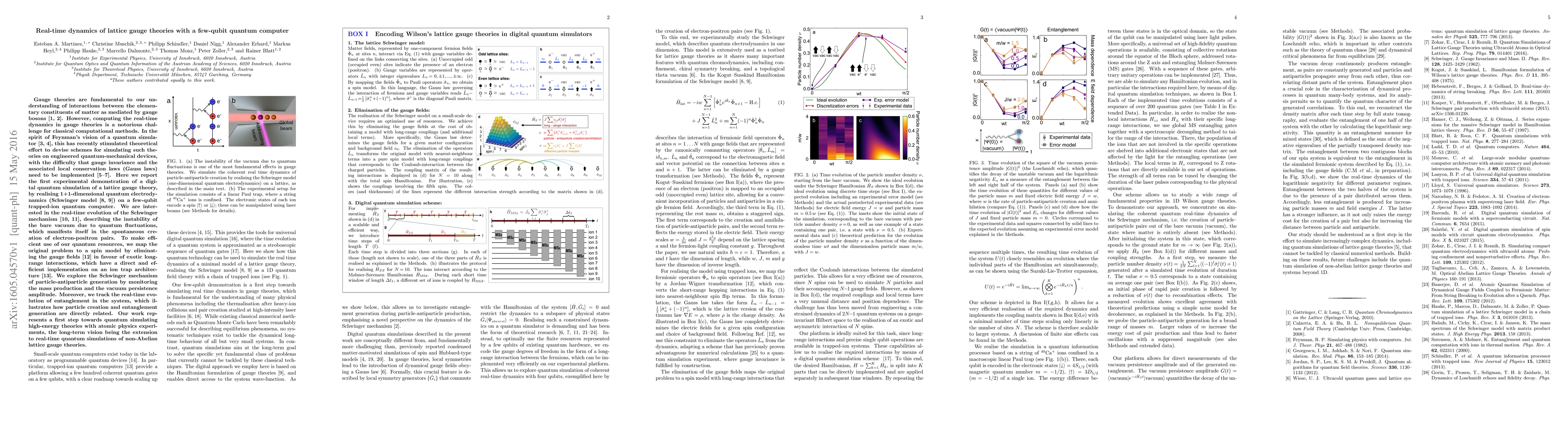 This paper reports the first digital quantum simulation of a lattice gauge theory using a few-qubit trapped-ion quantum computer, specifically the 1+1-dimensional quantum electrodynamics (Schwinger model). The study explores the real-time dynamics of the Schwinger mechanism, demonstrating the spontaneous creation of electron-positron pairs and tracking the evolution of entanglement, marking a significant step towards quantum simulations of high-energy theories.
