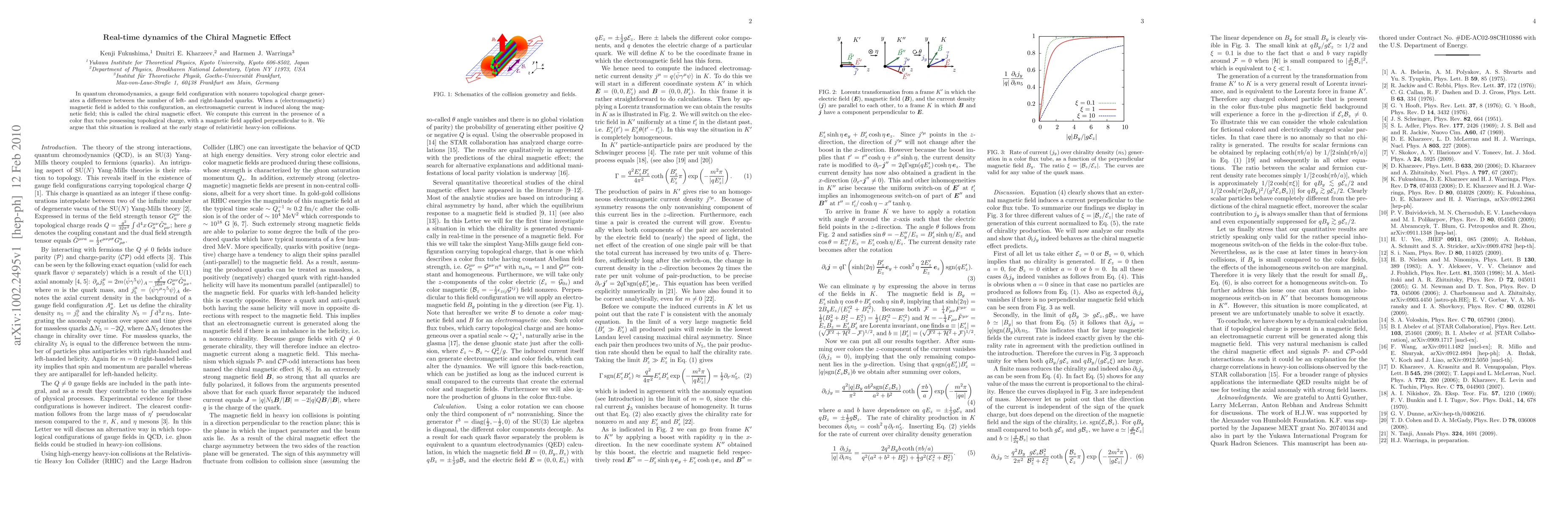 Researchers computed the chiral magnetic effect in relativistic heavy-ion collisions, finding an induced electromagnetic current along a color flux tube with a perpendicular magnetic field.