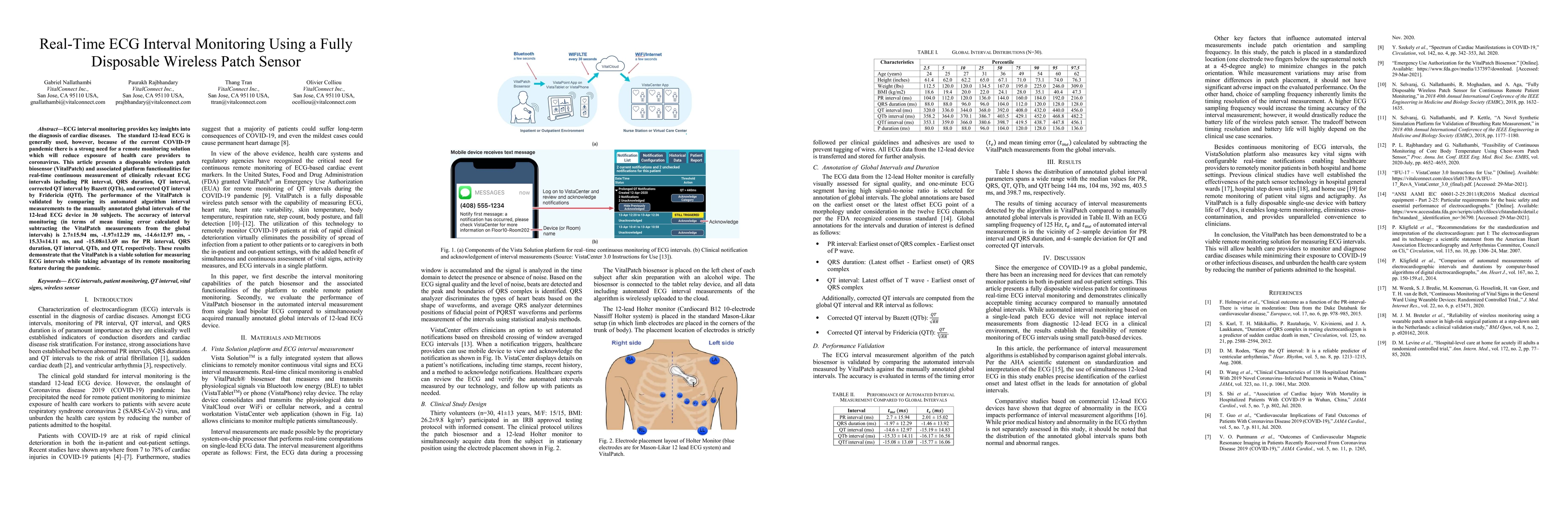 ECG interval monitoring provides key insights into the diagnosis of cardiac diseases. The standard 12-lead ECG is generally used, however, because of the current COVID-19 pandemic there is a strong need for a remote monitoring solution which will reduce exposure of health care providers to coronavirus. This article presents a disposable wireless patch biosensor (VitalPatch) and associated platform functionalities for real-time continuous measurement of clinically relevant ECG intervals including PR interval, QRS duration, QT interval, corrected QT interval by Bazett (QTb), and corrected QT interval by Fridericia (QTf). The performance of the VitalPatch is validated by comparing its automated algorithm interval measurements to the manually annotated global intervals of the 12-lead ECG device in 30 subjects. The accuracy of interval monitoring (in terms of mean timing error calculated by subtracting the VitalPatch measurements from the global intervals) is 2.7+/-15.94 ms, -1.97+/-12.29 ms, -14.6+/-12.97 ms, - 15.33+/-14.11 ms, and -15.08+/-13.69 ms for PR interval, QRS duration, QT interval, QTb, and QTf, respectively. These results demonstrate that the VitalPatch is a viable solution for measuring ECG intervals while taking advantage of its remote monitoring feature during the pandemic.