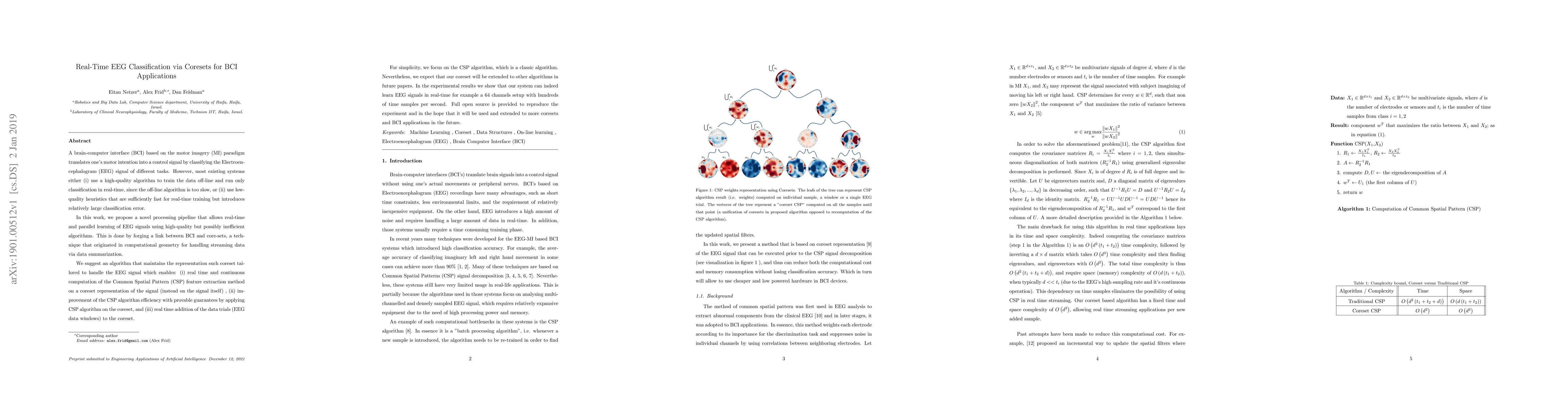 A brain-computer interface (BCI) based on the motor imagery (MI) paradigm translates one's motor intention into a control signal by classifying the Electroencephalogram (EEG) signal of different tasks. However, most existing systems either (i) use a high-quality algorithm to train the data off-line and run only classification in real-time, since the off-line algorithm is too slow, or (ii) use low-quality heuristics that are sufficiently fast for real-time training but introduces relatively large classification error. In this work, we propose a novel processing pipeline that allows real-time and parallel learning of EEG signals using high-quality but possibly inefficient algorithms. This is done by forging a link between BCI and core-sets, a technique that originated in computational geometry for handling streaming data via data summarization. We suggest an algorithm that maintains the representation such coreset tailored to handle the EEG signal which enables: (i) real time and continuous computation of the Common Spatial Pattern (CSP) feature extraction method on a coreset representation of the signal (instead on the signal itself) , (ii) improvement of the CSP algorithm efficiency with provable guarantees by applying CSP algorithm on the coreset, and (iii) real time addition of the data trials (EEG data windows) to the coreset. For simplicity, we focus on the CSP algorithm, which is a classic algorithm. Nevertheless, we expect that our coreset will be extended to other algorithms in future papers. In the experimental results we show that our system can indeed learn EEG signals in real-time for example a 64 channels setup with hundreds of time samples per second. Full open source is provided to reproduce the experiment and in the hope that it will be used and extended to more coresets and BCI applications in the future.