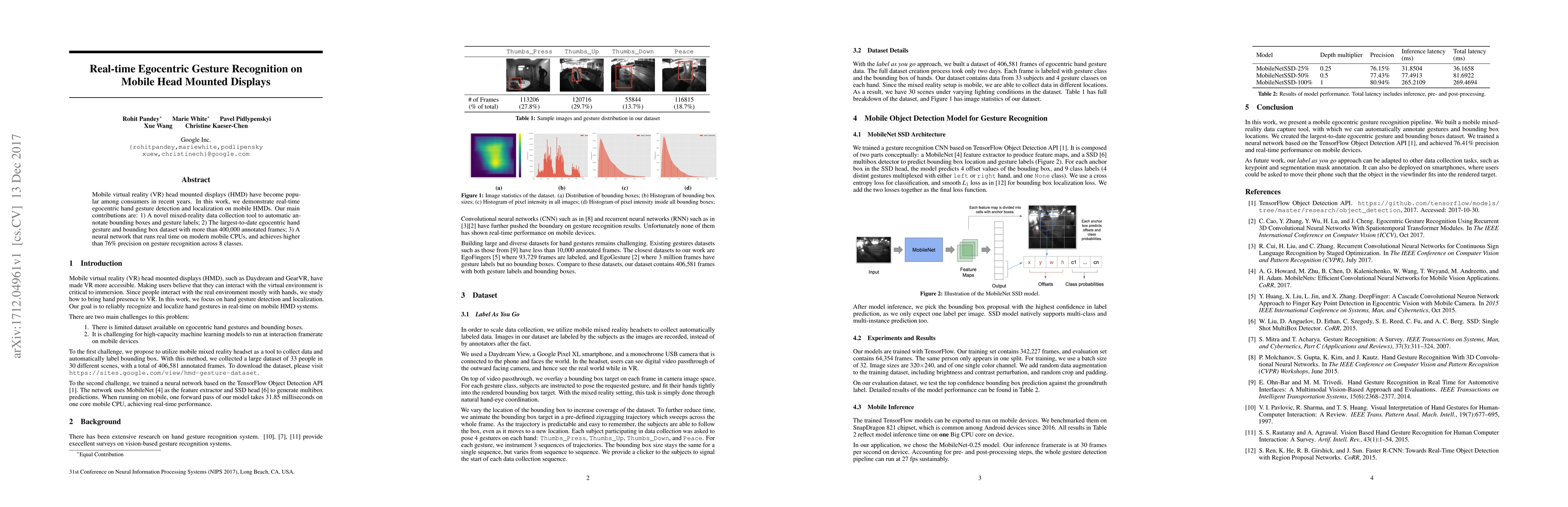 This paper presents a method for real-time egocentric gesture detection on mobile VR headsets, featuring a new data collection tool, a large annotated dataset, and a neural network achieving over 76% precision for 8 gesture classes, all running efficiently on mobile CPUs.