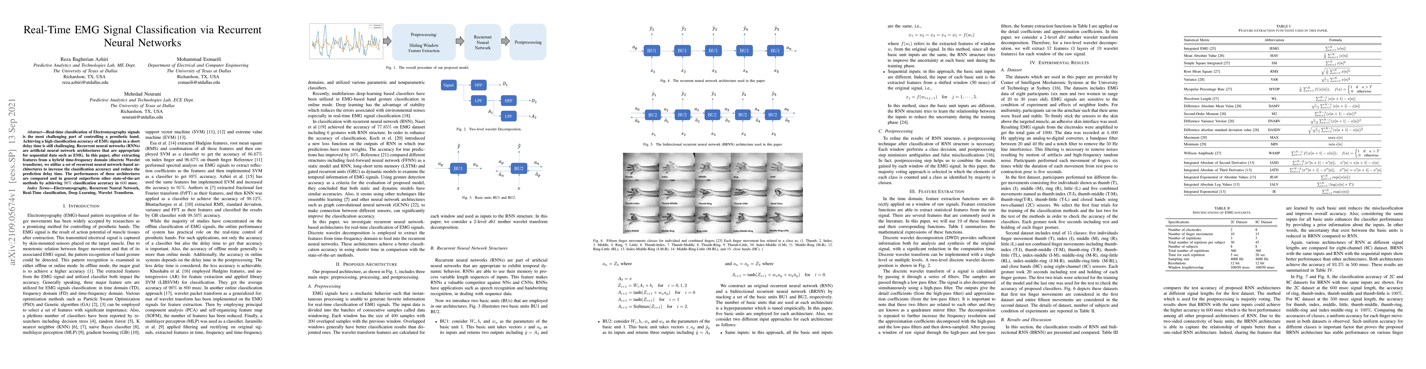 This paper explores the use of recurrent neural networks (RNNs) for real-time classification of Electromyography signals to control prosthetic hands. The study extracts features using a hybrid time-frequency domain approach and demonstrates that RNN-based architectures achieve 96% accuracy within 600 msec, outperforming other methods.
