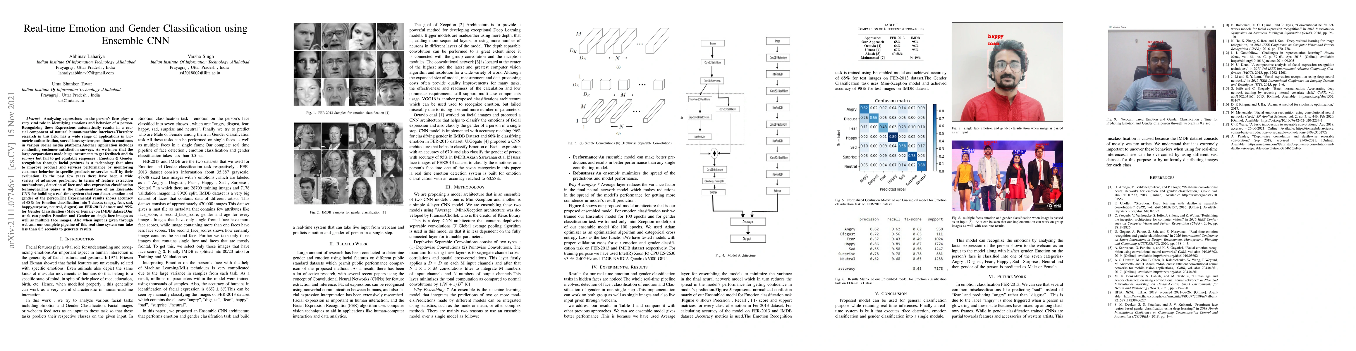 Analysing expressions on the person's face plays a very vital role in identifying emotions and behavior of a person. Recognizing these expressions automatically results in a crucial component of natural human-machine interfaces. Therefore research in this field has a wide range of applications in bio-metric authentication, surveillance systems , emotion to emoticons in various social media platforms. Another application includes conducting customer satisfaction surveys. As we know that the large corporations made huge investments to get feedback and do surveys but fail to get equitable responses. Emotion & Gender recognition through facial gestures is a technology that aims to improve product and services performance by monitoring customer behavior to specific products or service staff by their evaluation. In the past few years there have been a wide variety of advances performed in terms of feature extraction mechanisms , detection of face and also expression classification techniques. This paper is the implementation of an Ensemble CNN for building a real-time system that can detect emotion and gender of the person. The experimental results shows accuracy of 68% for Emotion classification into 7 classes (angry, fear , sad , happy , surprise , neutral , disgust) on FER-2013 dataset and 95% for Gender classification (Male or Female) on IMDB dataset. Our work can predict emotion and gender on single face images as well as multiple face images. Also when input is given through webcam our complete pipeline of this real-time system can take less than 0.5 seconds to generate results.