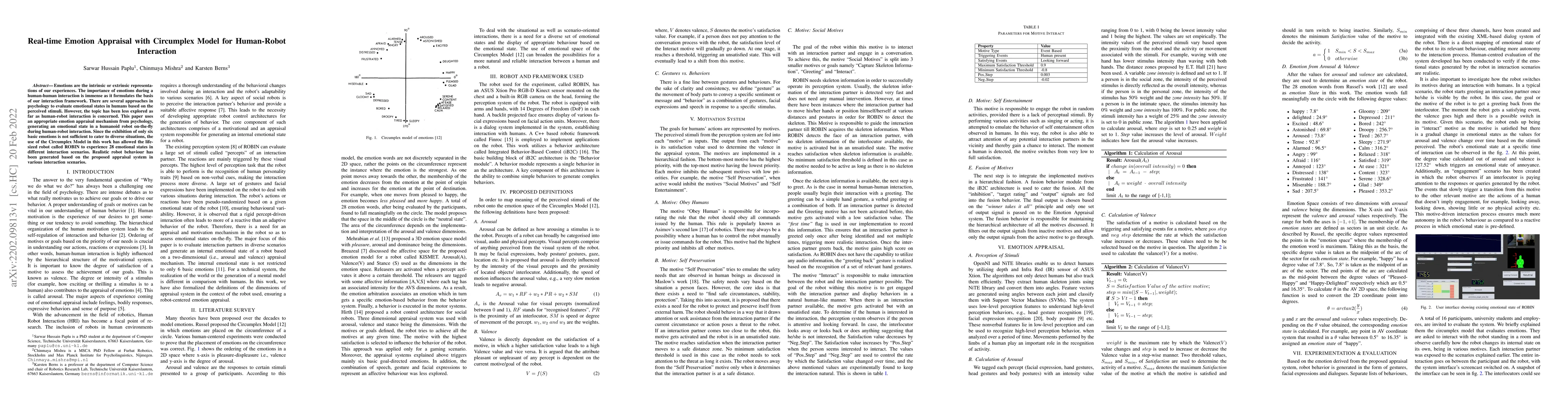 This paper develops a real-time emotion appraisal mechanism using the Circumplex Model to enable a humanoid robot, ROBIN, to experience and exhibit 28 emotional states during human-robot interactions, enhancing realistic robot behavior in diverse scenarios.