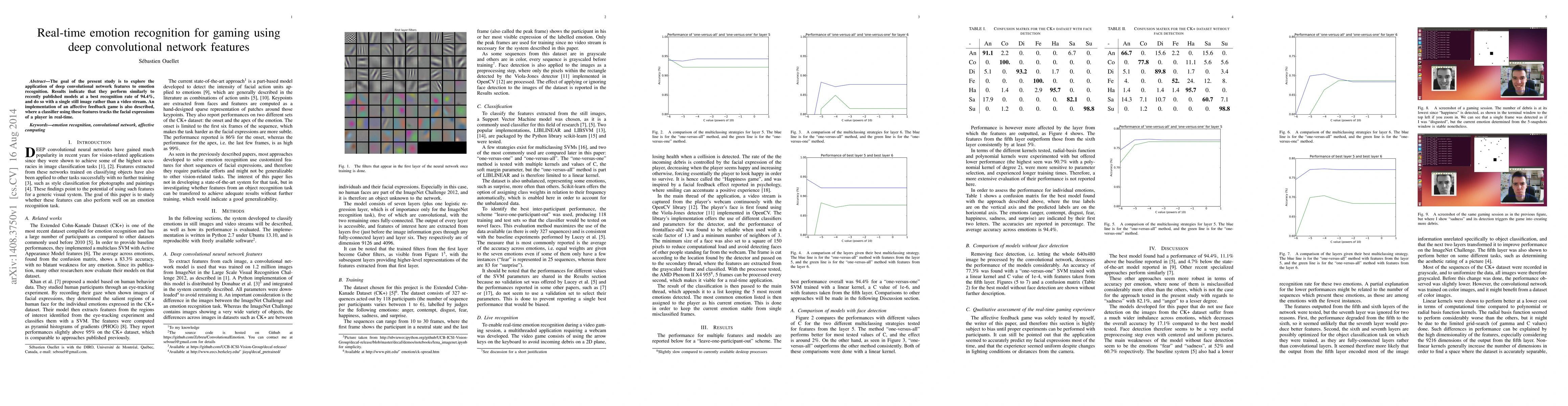 This study investigates deep convolutional network features for real-time emotion recognition in gaming, achieving a 94.4% recognition rate from single still images. An affective feedback game demonstrates the practical application of this technology in tracking player facial expressions.