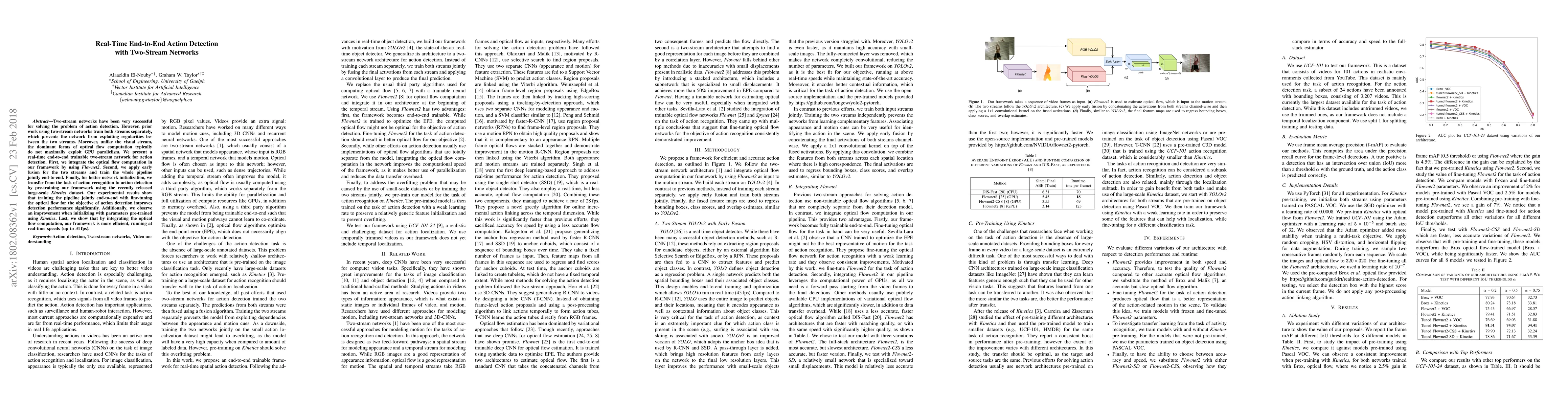 Two-stream networks have been very successful for solving the problem of action detection. However, prior work using two-stream networks train both streams separately, which prevents the network from exploiting regularities between the two streams. Moreover, unlike the visual stream, the dominant forms of optical flow computation typically do not maximally exploit GPU parallelism. We present a real-time end-to-end trainable two-stream network for action detection. First, we integrate the optical flow computation in our framework by using Flownet2. Second, we apply early fusion for the two streams and train the whole pipeline jointly end-to-end. Finally, for better network initialization, we transfer from the task of action recognition to action detection by pre-training our framework using the recently released large-scale Kinetics dataset. Our experimental results show that training the pipeline jointly end-to-end with fine-tuning the optical flow for the objective of action detection improves detection performance significantly. Additionally, we observe an improvement when initializing with parameters pre-trained using Kinetics. Last, we show that by integrating the optical flow computation, our framework is more efficient, running at real-time speeds (up to 31 fps).