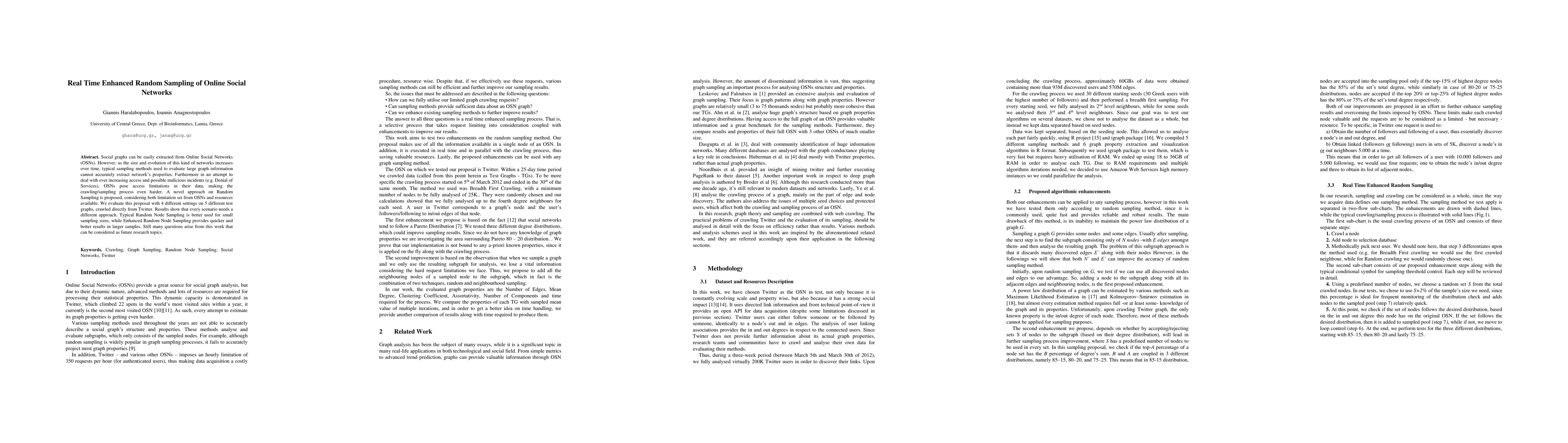 Social graphs can be easily extracted from Online Social Networks. However these networks are getting larger from day to day. Sampling methods used to evaluate graph information cannot accurately extract graph properties. Furthermore Social Networks are limiting the access to their data, making the crawling process even harder. A novel approach on Random Sampling is proposed, considering both limitation and resources. We evaluate this proposal with 4 different settings on 5 different Test Graphs, crawled directly from Twitter. Through comparing the results we observe the pros and cons of its method as well as their resource allocation. Concluding we present their best area of application.