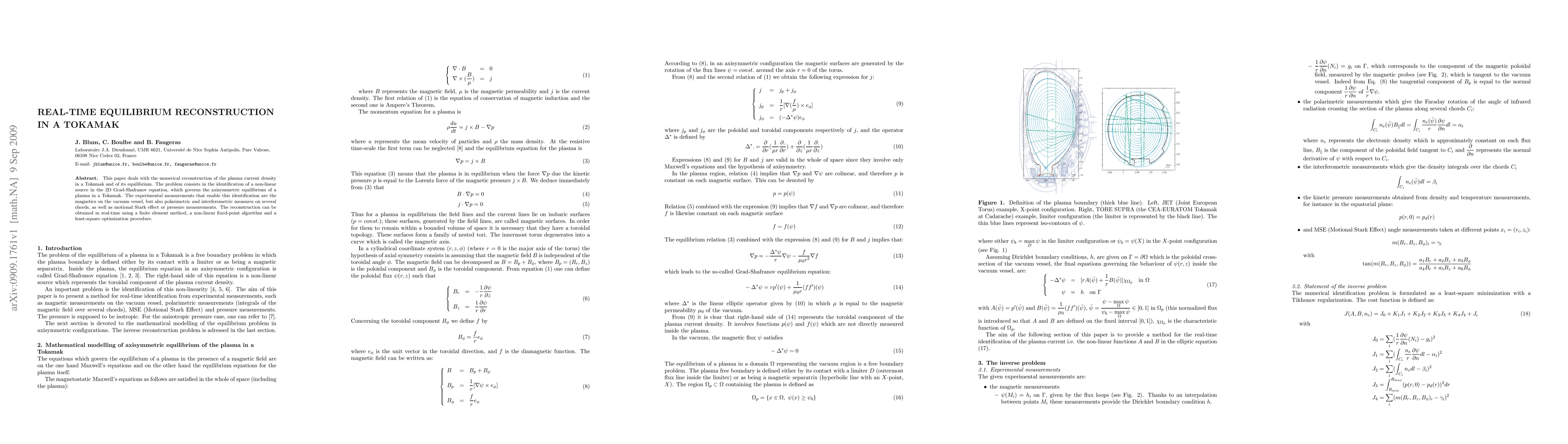 This paper deals with the numerical reconstruction of the plasma current density in a Tokamak and of its equilibrium. The problem consists in the identification of a non-linear source in the 2D Grad-Shafranov equation, which governs the axisymmetric equilibrium of a plasma in a Tokamak. The experimental measurements that enable this identification are the magnetics on the vacuum vessel, but also polarimetric and interferometric measures on several chords, as well as motional Stark effect or pressure measurements. The reconstruction can be obtained in real-time using a finite element method, a non-linear fixed-point algorithm and a least-square optimization procedure.