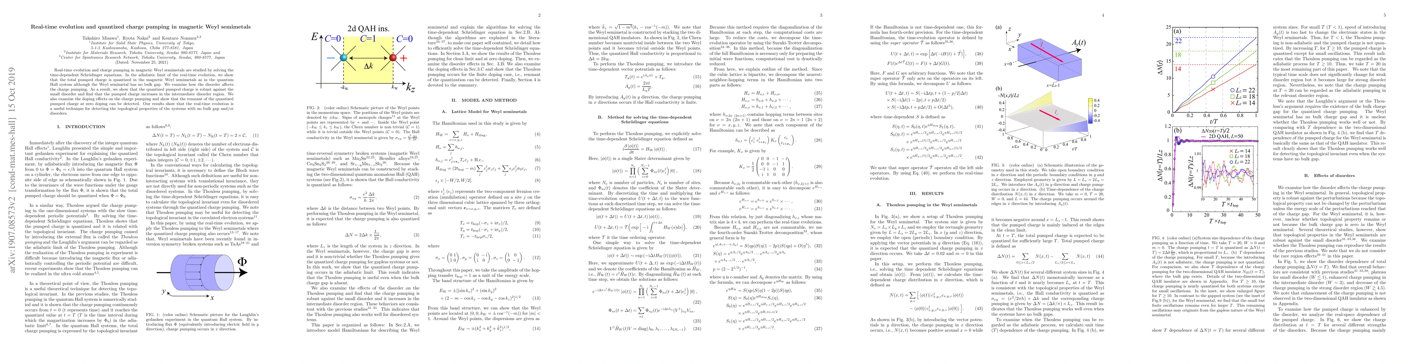 This paper studies real-time evolution and charge pumping in magnetic Weyl semimetals using time-dependent Schrödinger equations, demonstrating quantized charge pumping akin to the quantum Hall effect despite no bulk gap. It reveals robustness against small disorder and an increase in pumped charge with intermediate disorder, while showing detectable quantized charge pumping effects even at zero doping.