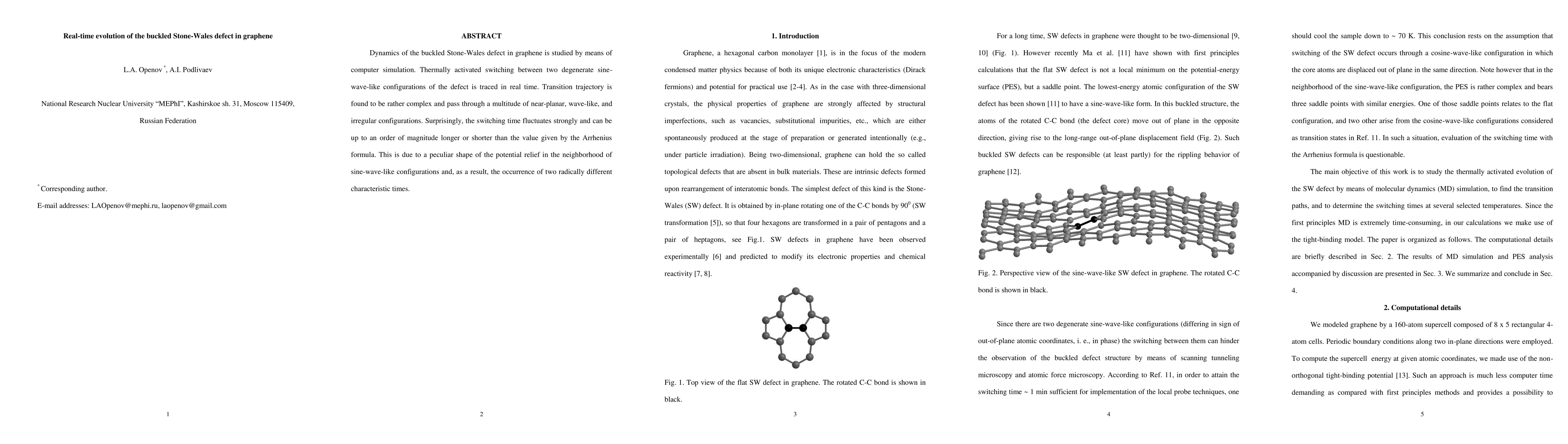 This research investigates the real-time dynamics of a buckled Stone-Wales defect in graphene via computer simulations, revealing complex transition trajectories and significant fluctuations in switching times, challenging predictions based on the Arrhenius formula due to the unique potential landscape.