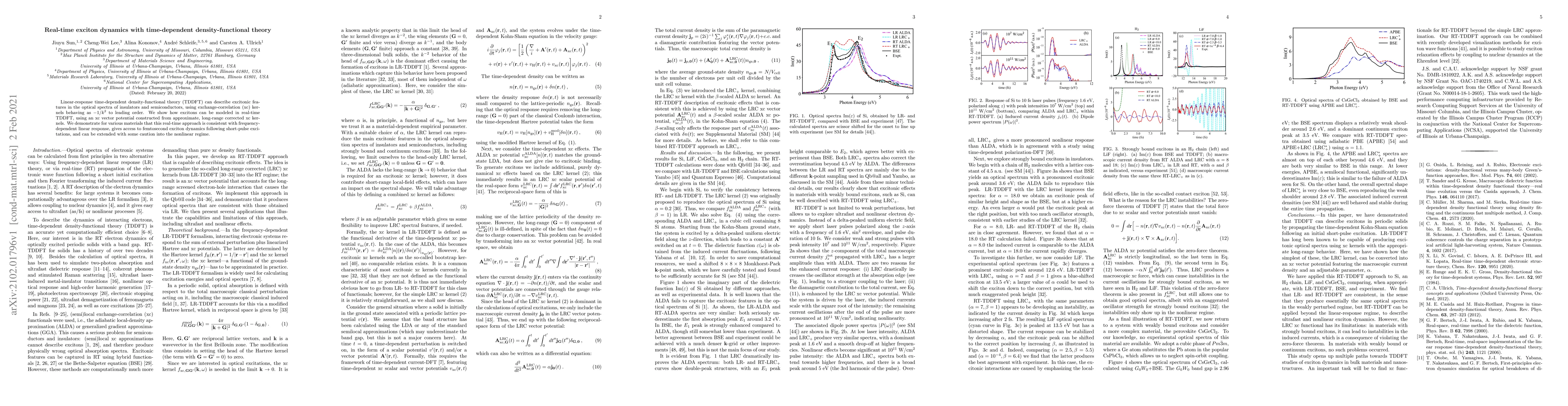 This paper demonstrates a real-time exciton dynamics model using time-dependent density-functional theory (TDDFT) with long-range corrected exchange-correlation kernels, showing consistency with linear response and enabling femtosecond exciton dynamics analysis. The approach can cautiously extend into the nonlinear regime.