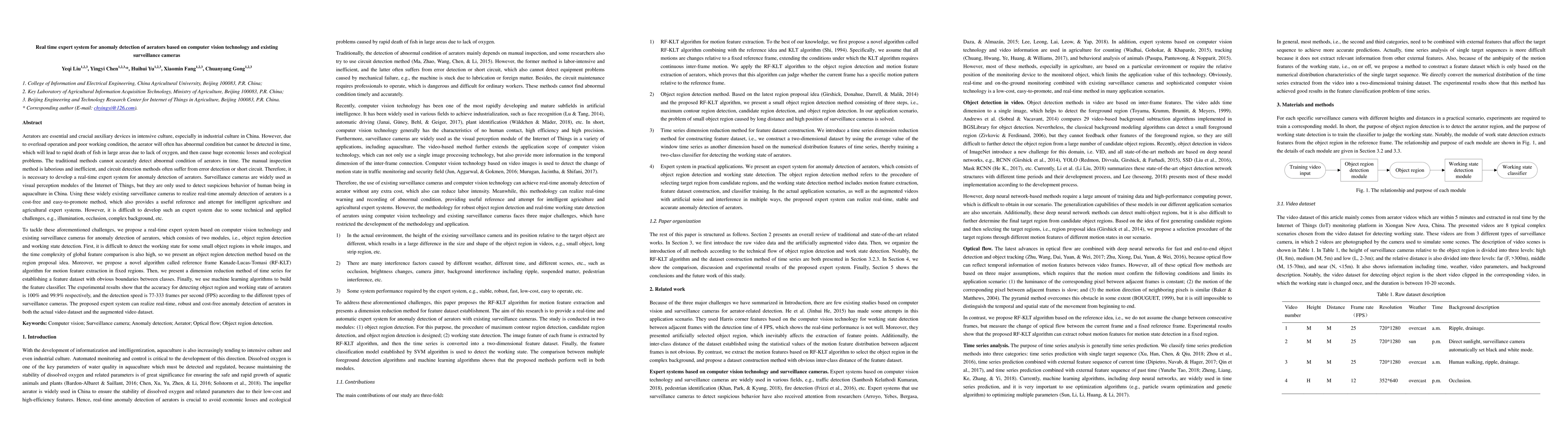 Aerators are essential and crucial auxiliary devices in intensive culture, especially in industrial culture in China. The traditional methods cannot accurately detect abnormal condition of aerators in time. Surveillance cameras are widely used as visual perception modules of the Internet of Things, and then using these widely existing surveillance cameras to realize real-time anomaly detection of aerators is a cost-free and easy-to-promote method. However, it is difficult to develop such an expert system due to some technical and applied challenges, e.g., illumination, occlusion, complex background, etc. To tackle these aforementioned challenges, we propose a real-time expert system based on computer vision technology and existing surveillance cameras for anomaly detection of aerators, which consists of two modules, i.e., object region detection and working state detection. First, it is difficult to detect the working state for some small object regions in whole images, and the time complexity of global feature comparison is also high, so we present an object region detection method based on the region proposal idea. Moreover, we propose a novel algorithm called reference frame Kanade-Lucas-Tomasi (RF-KLT) algorithm for motion feature extraction in fixed regions. Then, we present a dimension reduction method of time series for establishing a feature dataset with obvious boundaries between classes. Finally, we use machine learning algorithms to build the feature classifier. The experimental results in both the actual video dataset and the augmented video dataset show that the accuracy for detecting object region and working state of aerators is 100% and 99.9% respectively, and the detection speed is 77-333 frames per second (FPS) according to the different types of surveillance cameras.