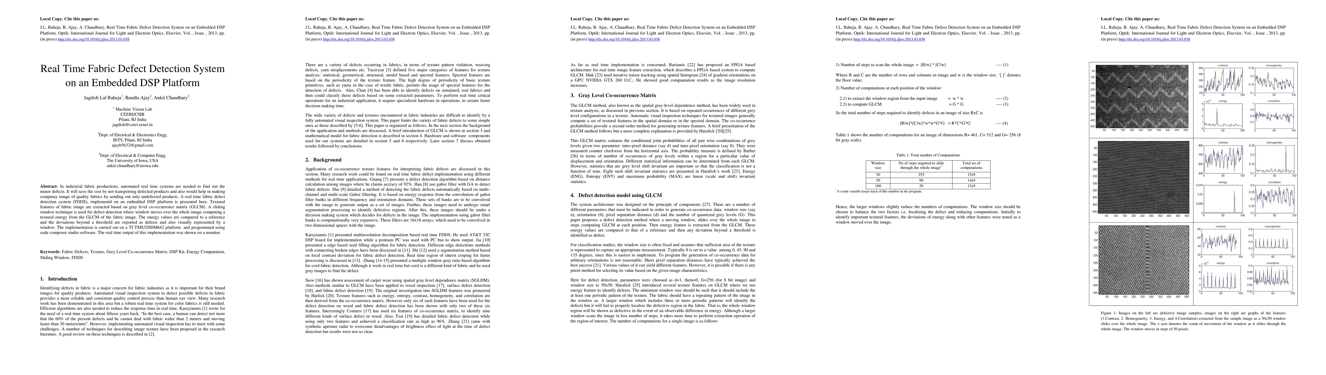 This paper presents a real-time fabric defect detection system implemented on an embedded DSP platform using textural features extracted via gray level co-occurrence matrix (GLCM) and a sliding window technique. The system detects defects by comparing computed textural energy values against a reference threshold and visually represents detected defects on a monitor.