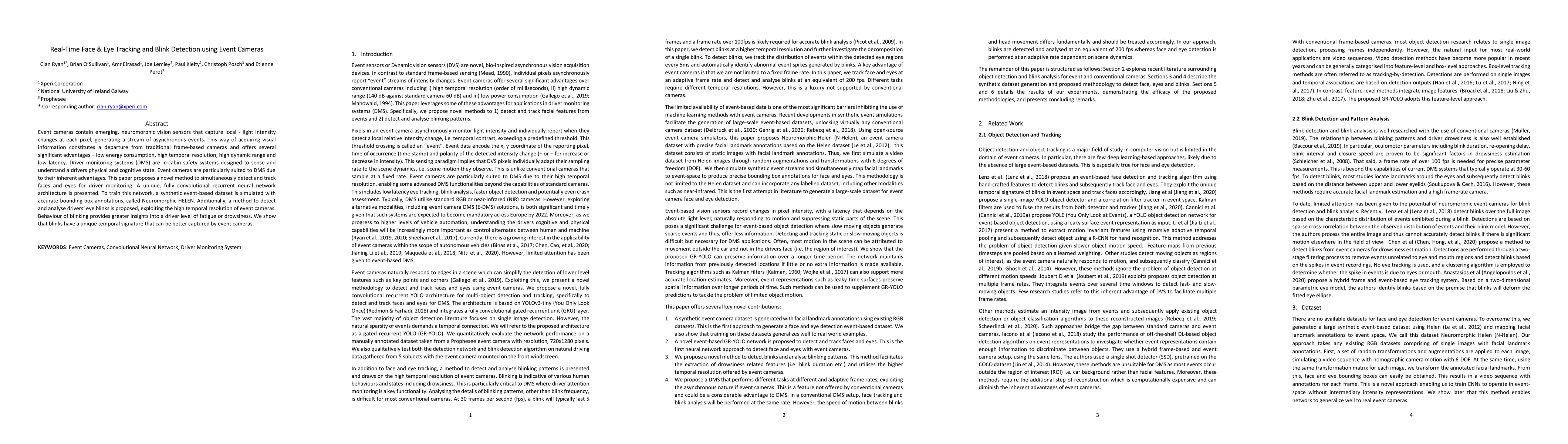 This paper proposes a novel method for real-time face and eye tracking, as well as blink detection using event cameras, leveraging their low energy consumption and high temporal resolution. A synthetic dataset, Neuromorphic HELEN, is used to train a fully convolutional recurrent neural network, demonstrating improved fatigue or drowsiness detection through unique blink temporal signatures.
