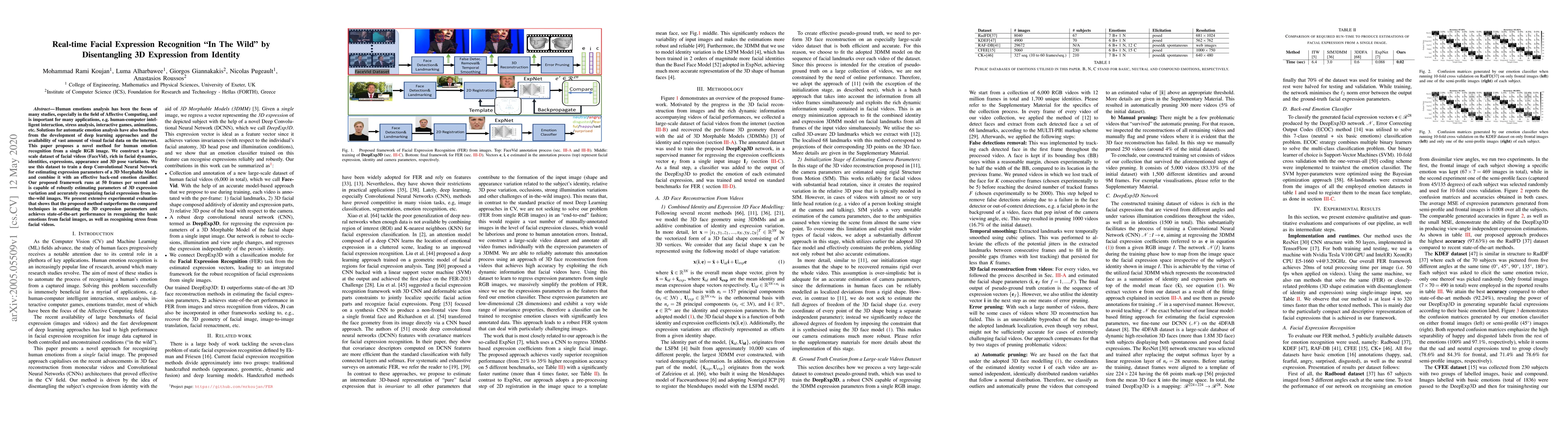This paper introduces a novel method for real-time facial expression recognition using a deep Convolutional Neural Network trained on a large-scale dataset (\textbf{FaceVid}) to disentangle 3D expression from identity, achieving state-of-the-art performance in emotion and stress recognition from in-the-wild images.