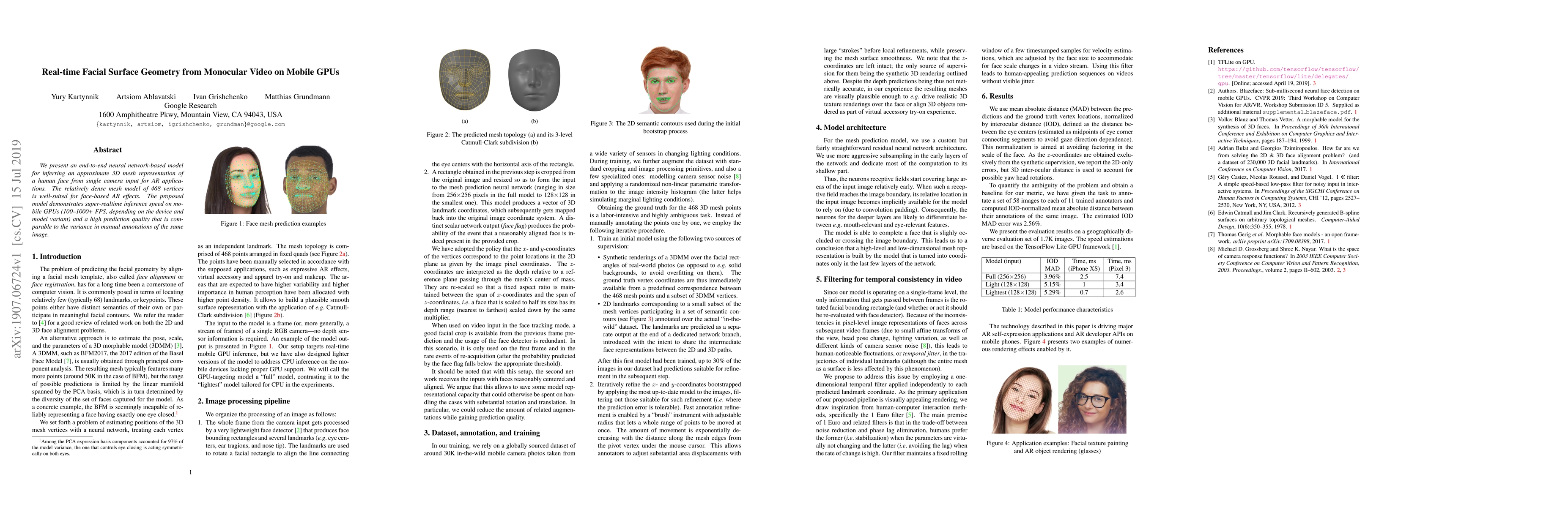 This paper introduces a neural network model for real-time inference of a 3D mesh representation of human faces from single camera inputs, suitable for AR applications. The model achieves super-realtime performance on mobile GPUs and maintains high prediction quality comparable to manual annotations.