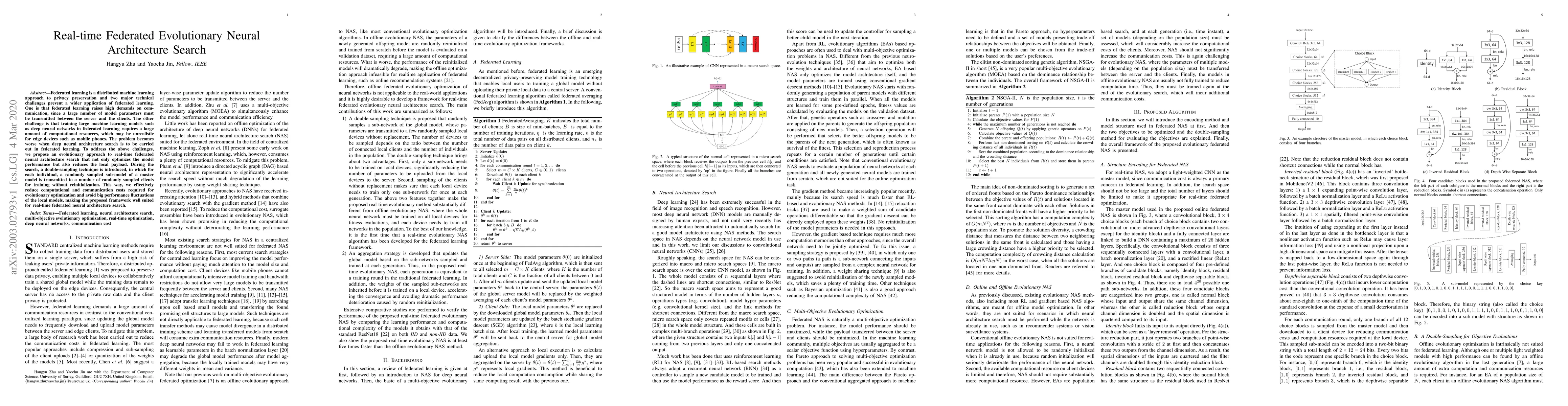 This paper proposes an evolutionary approach to real-time federated neural architecture search, addressing high communication and computational demands by using a double-sampling technique to transmit sub-models, thus reducing costs and performance fluctuations.