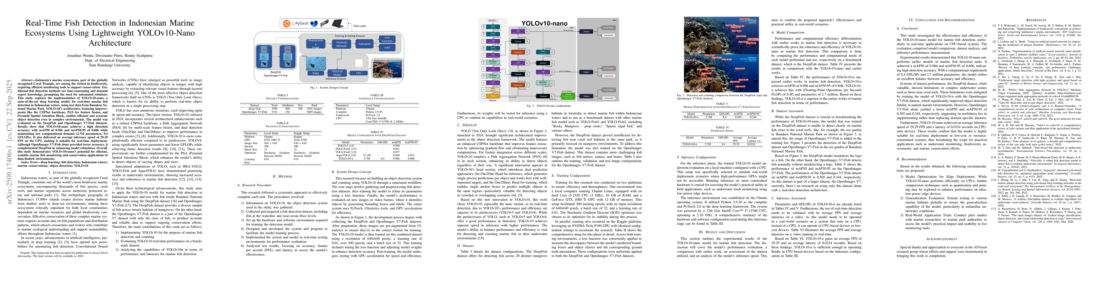 The work introduces the first application of YOLOv10-nano for real-time marine fish detection in Indonesian waters, combining DeepFish and OpenImages V7-Fish datasets to enhance robustness in coral reef environments.