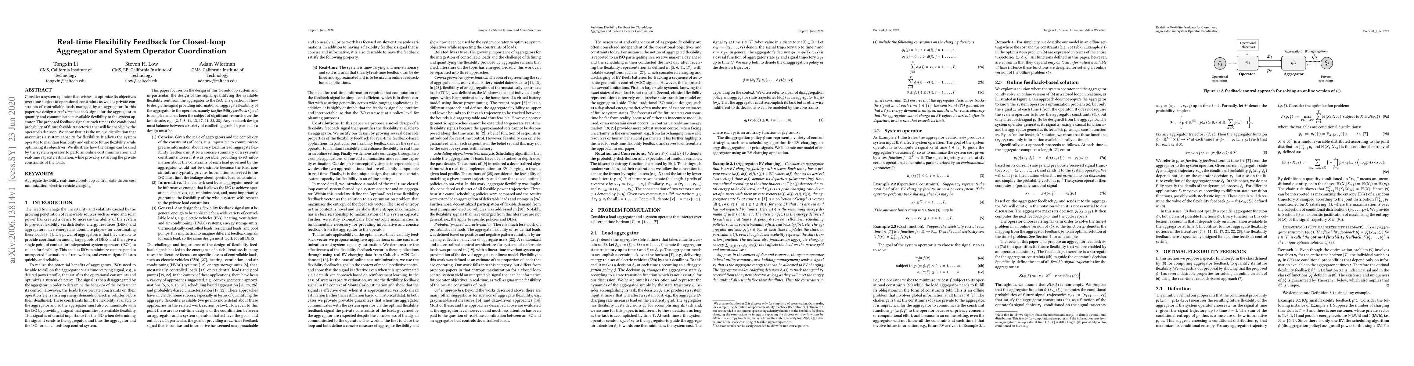 Aggregators have emerged as crucial tools for the coordination of distributed, controllable loads. However, to be used effectively, aggregators must be able to communicate the available flexibility of the loads they control to the system operator in a manner that is both (i) concise enough to be scalable to aggregators governing hundreds or even thousands of loads and (ii) informative enough to allow the system operator to send control signals to the aggregator that lead to optimization of system-level objectives, such as cost minimization, and do not violate private constraints of the loads, such as satisfying specific load demands. In this paper, we present the design of a real-time flexibility feedback signal based on maximization of entropy. The design provides a concise and informative signal that can be used by the system operator to perform online cost minimization and real-time capacity estimation, while provably satisfying the private constraints of the loads. In addition to deriving analytic properties of the design, we illustrate the effectiveness of the design using a dataset from an adaptive electric vehicle charging network.