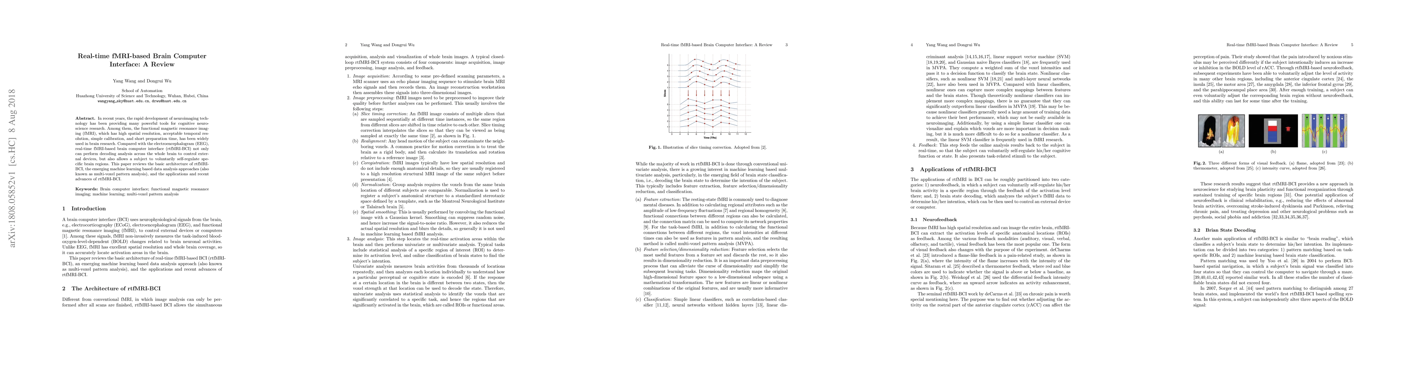 In recent years, the rapid development of neuroimaging technology has been providing many powerful tools for cognitive neuroscience research. Among them, the functional magnetic resonance imaging (fMRI), which has high spatial resolution, acceptable temporal resolution, simple calibration, and short preparation time, has been widely used in brain research. Compared with the electroencephalogram (EEG), real-time fMRI-based brain computer interface (rtfMRI-BCI) not only can perform decoding analysis across the whole brain to control external devices, but also allows a subject to voluntarily self-regulate specific brain regions. This paper reviews the basic architecture of rtfMRI-BCI, the emerging machine learning based data analysis approaches (also known as multi-voxel pattern analysis), and the applications and recent advances of rtfMRI-BCI.