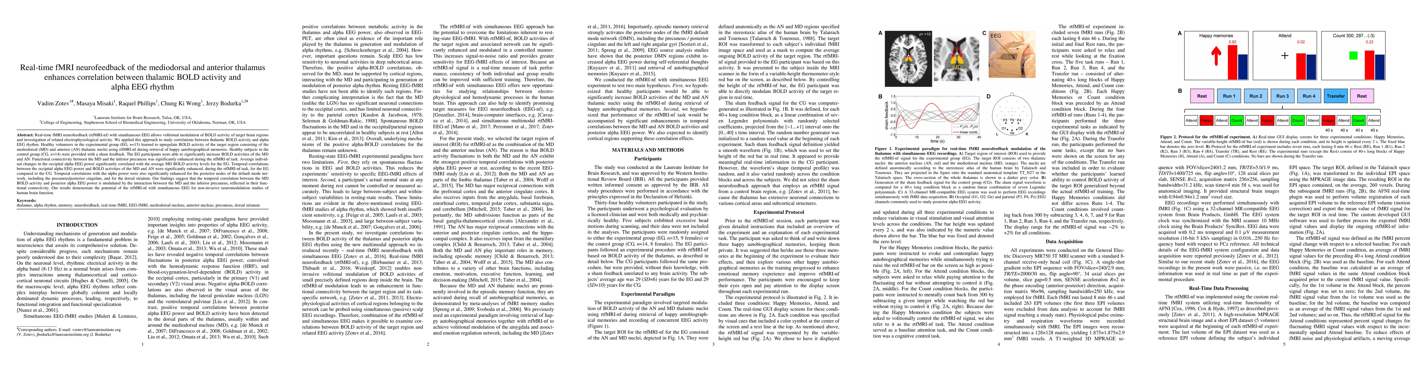 This study demonstrates that real-time fMRI neurofeedback can enhance the correlation between mediodorsal and anterior thalamic BOLD activity and alpha EEG rhythm, showing increased functional connectivity and temporal correlations in healthy volunteers compared to a control group.