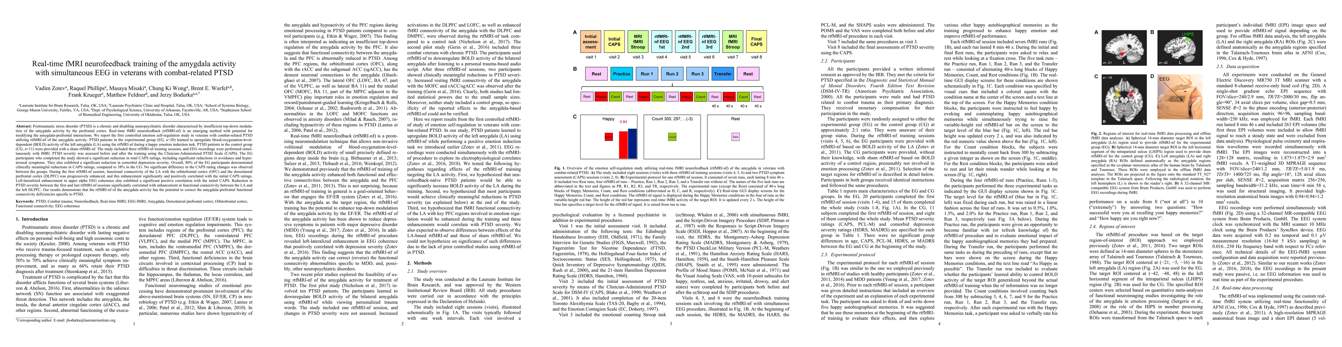 This study investigates the efficacy of real-time fMRI neurofeedback training on amygdala activity in veterans with combat-related PTSD, showing significant symptom reduction and enhanced amygdala-prefrontal connectivity in the experimental group compared to a control group.