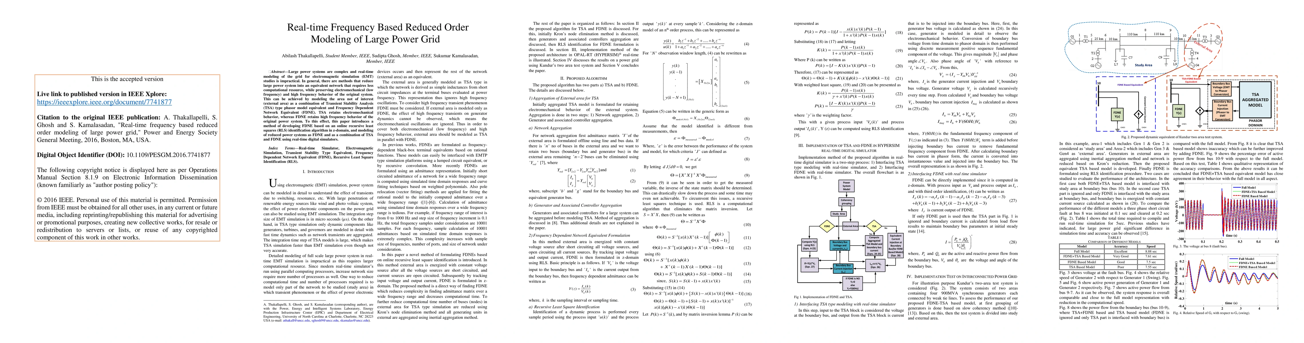 Large power systems are complex and real-time modeling of the grid for electromagnetic simulation (EMT) studies is impractical. In general, there are methods that reduce large power system into an equivalent network that requires less computational resource, while preserving electromechanical (low frequency) and high frequency behavior of the original system. This can be achieved by modeling the area not of interest (external area) as a combination of Transient Stability Analysis (TSA) type phasor model equivalent and Frequency Dependent Network Equivalent (FDNE). TSA retains electromechanical behavior, whereas FDNE retains high frequency behavior of the original power system. To this effect, this paper introduces a method of developing FDNE based on an online recursive least squares (RLS) identification algorithm in z-domain, and modeling of reduced power systems as FDNE and as a combination of TSA and FDNE using real-time digital simulators.