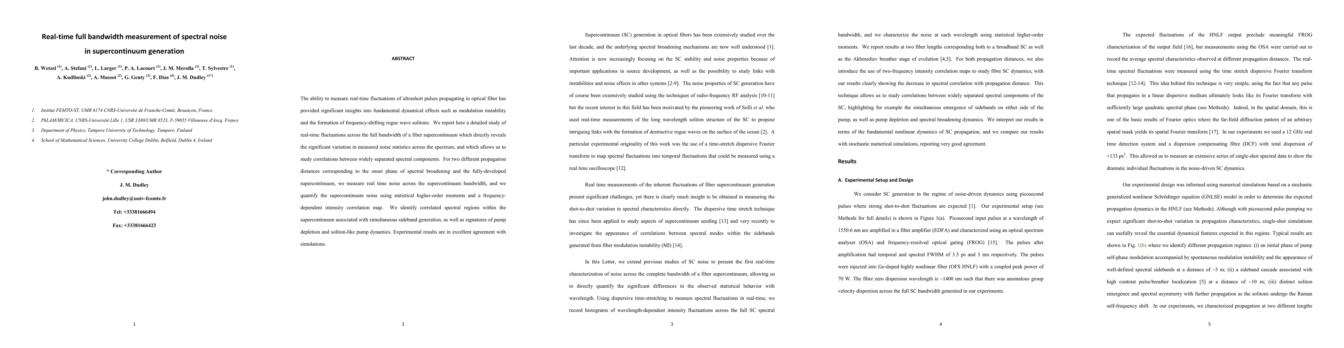 This paper reports on real-time measurements of spectral noise fluctuations across the full bandwidth of a fiber supercontinuum, revealing significant variations in noise statistics and correlations between spectral components. The study identifies correlated spectral regions and soliton-like dynamics, with experimental results matching simulations.